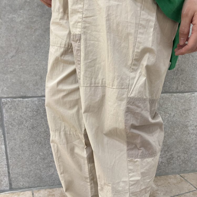 生地は綿100%のサラッとした綾目のある生地とタイプライターの生地を組み合わせています。 綾目の生地は部分的に裏使いして、バックサテンに見えるようにしています。 製品洗い加工しているので、お家でイージーケアできます。 同色系の切り替えにしているので、デザイン以上に着合わせしやすいパンツ◎