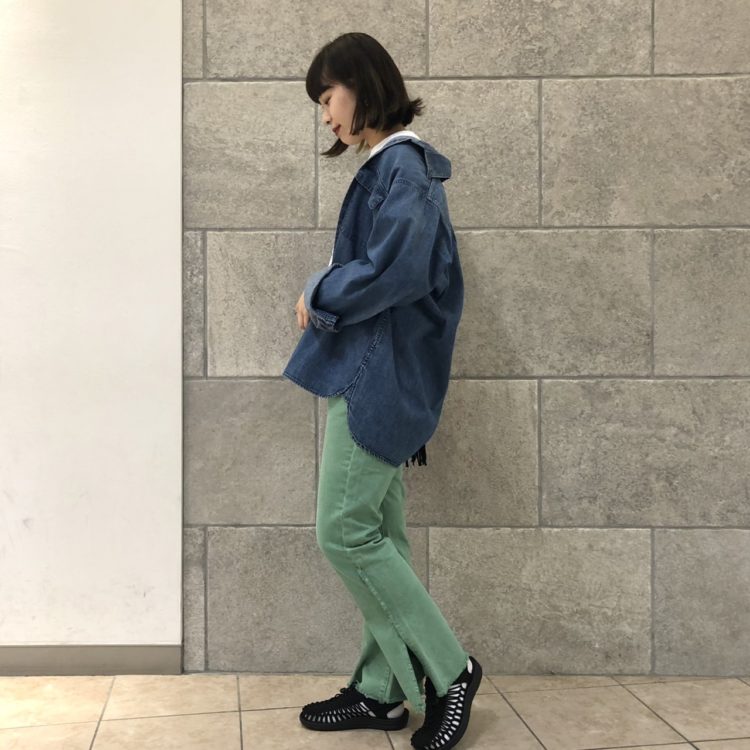カジュアルスタイルの王道、「Tシャツ×デニム」のコーデは、今年のトレンド“グリーン”を取り入れて◎デニムシャツは抜き襟で着ることでお洒落に♩Tシャツのチラリと見えるプリントがポイントです!足元は黒でコーデにメリハリを。
