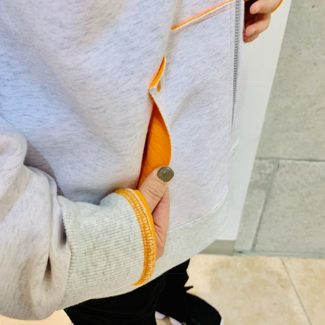 表地には、織り交ぜた糸で作る杢調スウェット生地。