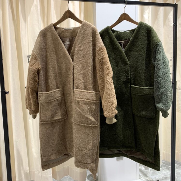 【異素材切り替えノーカラーコート】 no.142-984-0023218 size.M color.モカ、カーキ price.¥12,000+tax 腕のボア切り替えが目を引くデザイン! カジュアルも綺麗めコーデにも活躍! これからのシーズン、忘年会や クリスマスなどイベントにも使いやすいです ノーカラーコートなので、 ストールなどの小物使いもしやすいコートです。 閉めて着ると首元はVネックなので 顔まわりもすっきりとした印象に!