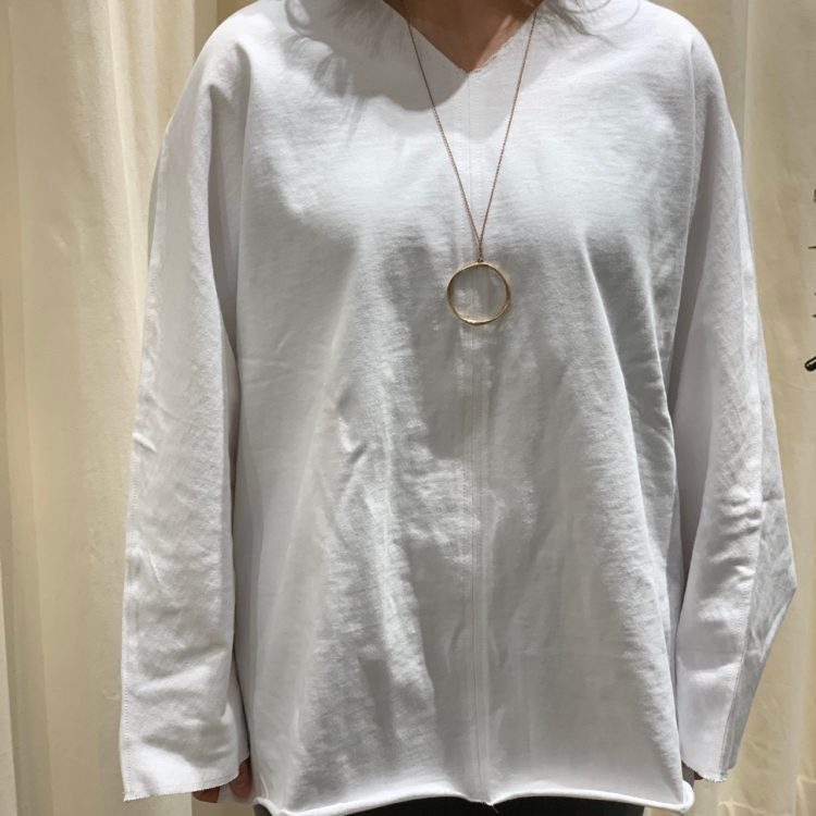 首元、袖口、裾が切りっぱなしの様なデザイン。