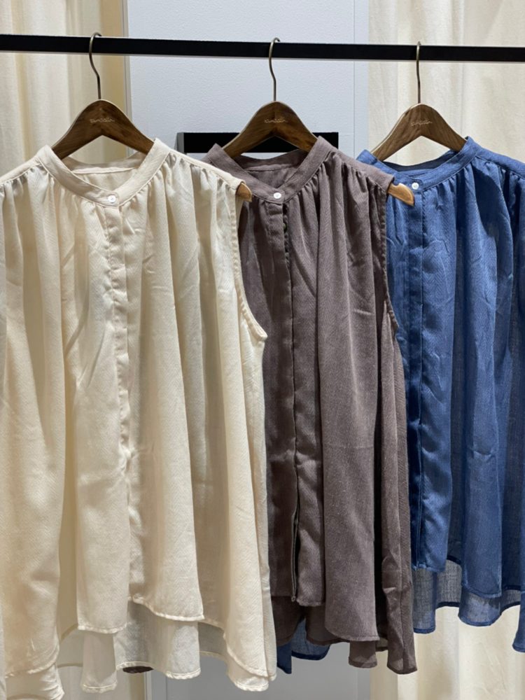 ガーゼヘリンボーンギャザーバンドカラーノースリーブブラウス