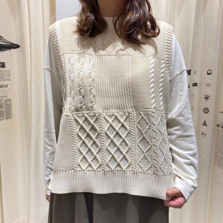 ラン模様ケーブル編みなど、パッチワーク風に施されているニットベスト!