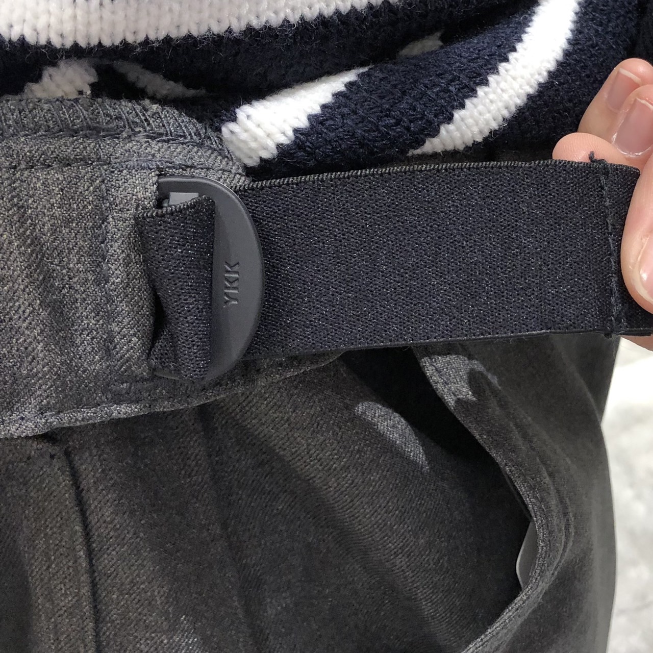 その秘密はウエストの左右に配したバンドアジャスターにあります。簡単に片手でサイズ調節できます!しかも調整範囲を左右のアジャスターで、前部・後部と独立して調整ができ、前後の調整具合で穿きこなしの雰囲気を変えることも可能です♩