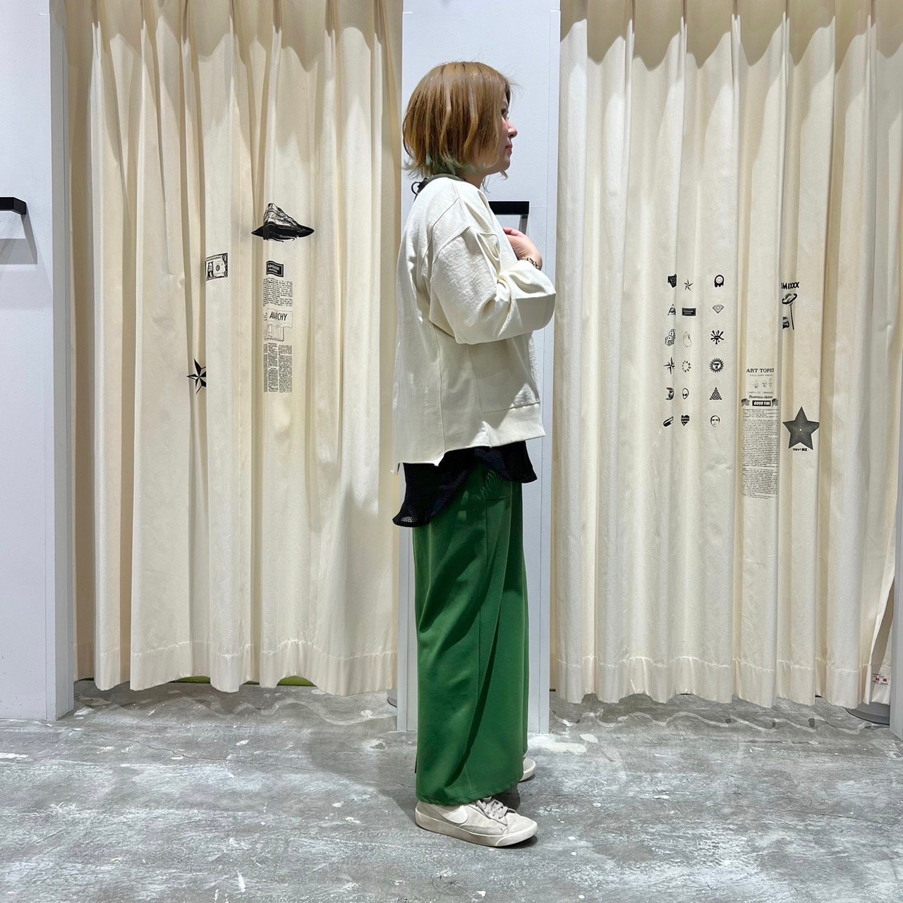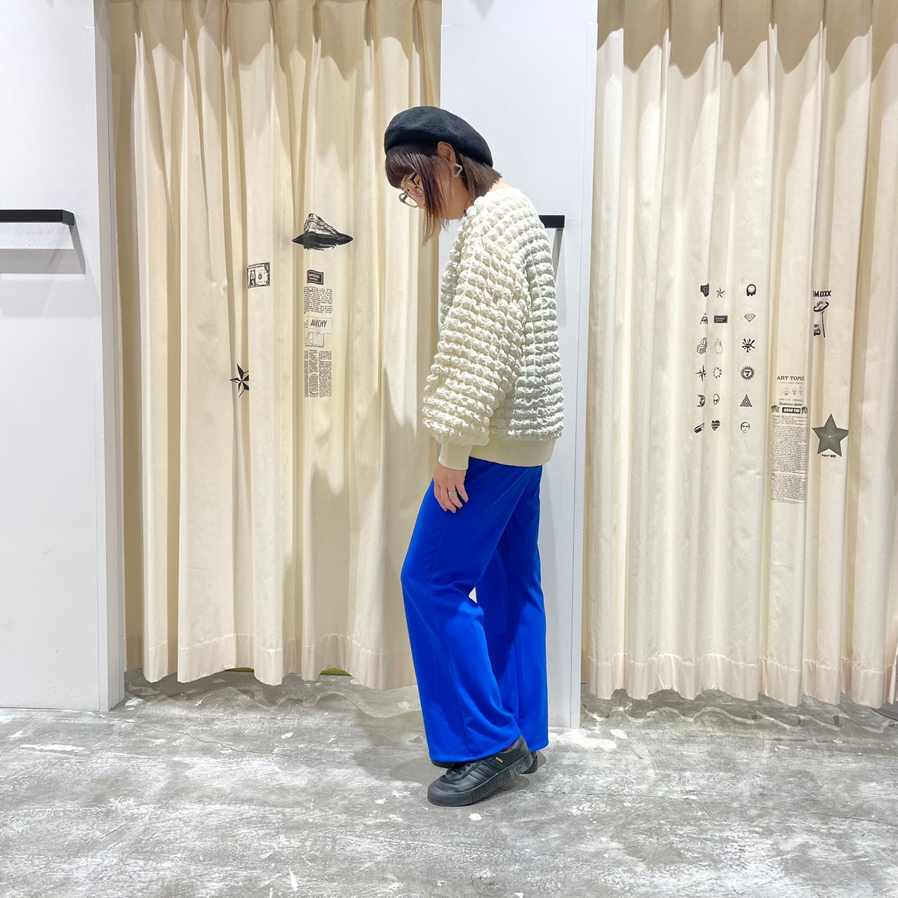 フレアなイージーパンツですが、ホワイト×ブルーの組み合わせは