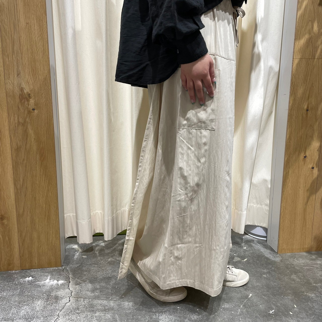 レーヨンナイロン素材に、バイオ加工を施した独特の風合いとシャリが特徴的なワイドパンツ。
