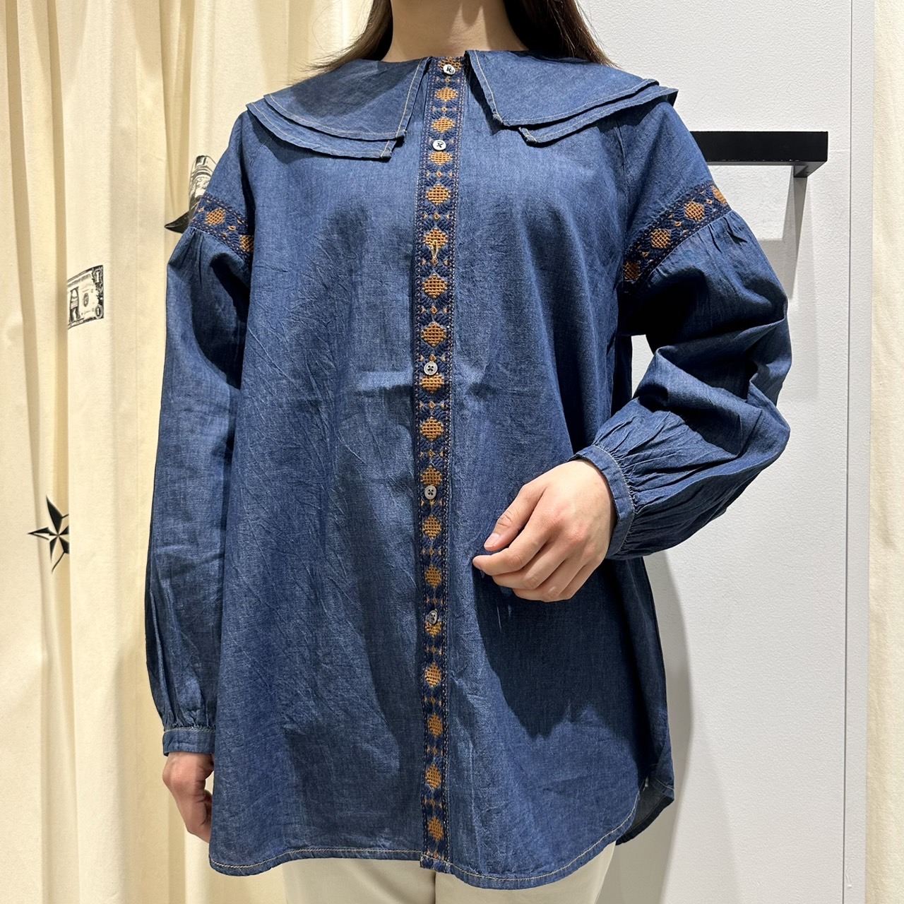 刺繍が可愛いデニムのブラウス。大きな襟が特徴的です!着丈は少し長めで、サラリと軽い着心地◎ラブリーだけれど大人っぽく着られます。