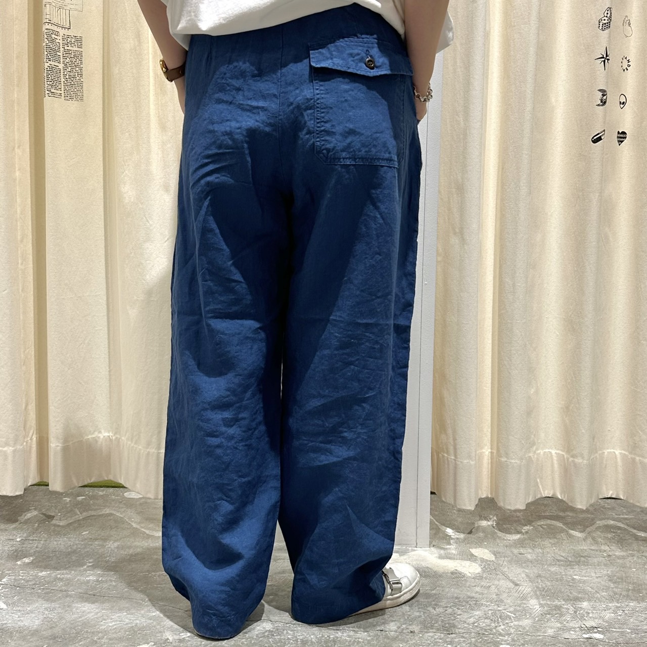 こちらのパンツは、高密度の JAPAN LINEN を岡山県でインディゴ後染めした生地を使用したシリーズです。 インディゴ染めは、糸の表面に染色されるので洗いこめば洗いこむほど、 デニムのようなインディゴの色落ちを感じ、リネンの風合いの良さと相まってヴィンテージな 雰囲気を楽しむことができます♩ストンと落ちるストレートシルエットで形がとても綺麗です◎