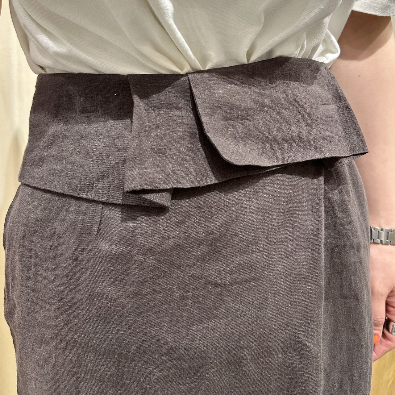折り返したようなウエストがポイントのドレープタックスカート。ラップスカートのようなストレートスカートですが、ラップ状ではないので足さばきを気にすることなく穿くことができます♩麻素材なので涼しげでサラリとした生地感です。