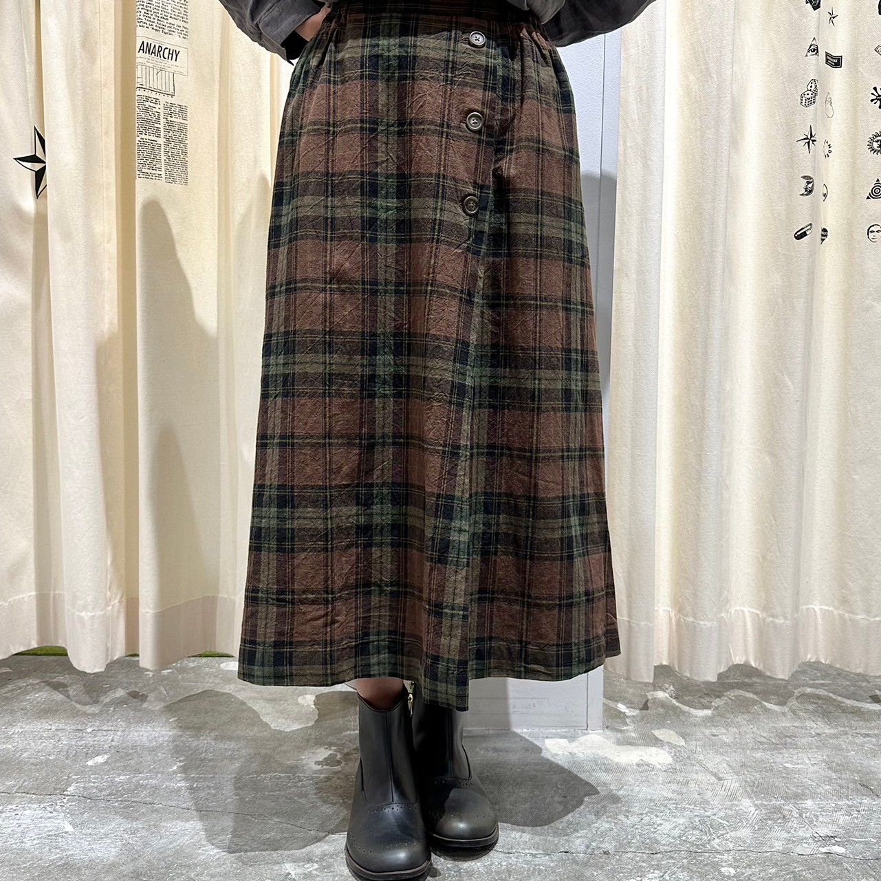 綿麻平織チェックラップ風スカート