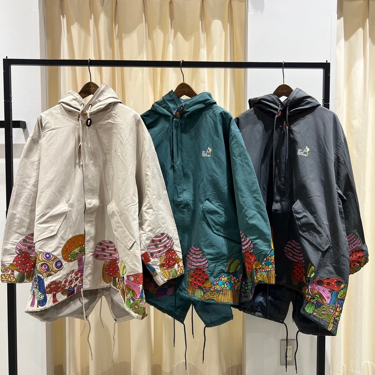 今年のモッズコートは裾から腰にかけて刺繍した「ポップなキノコ」デザイン!!