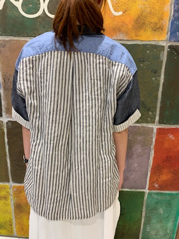 肩の切り替えから、ストライプに!袖を折り返すと同じく柄が出てきます。