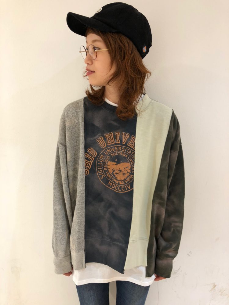異なるスウェットを繋ぎ合わせたような、思い切ったリメイク加工。アシンメトリーな裾のバランスも着るたびにワクワクしそうです。