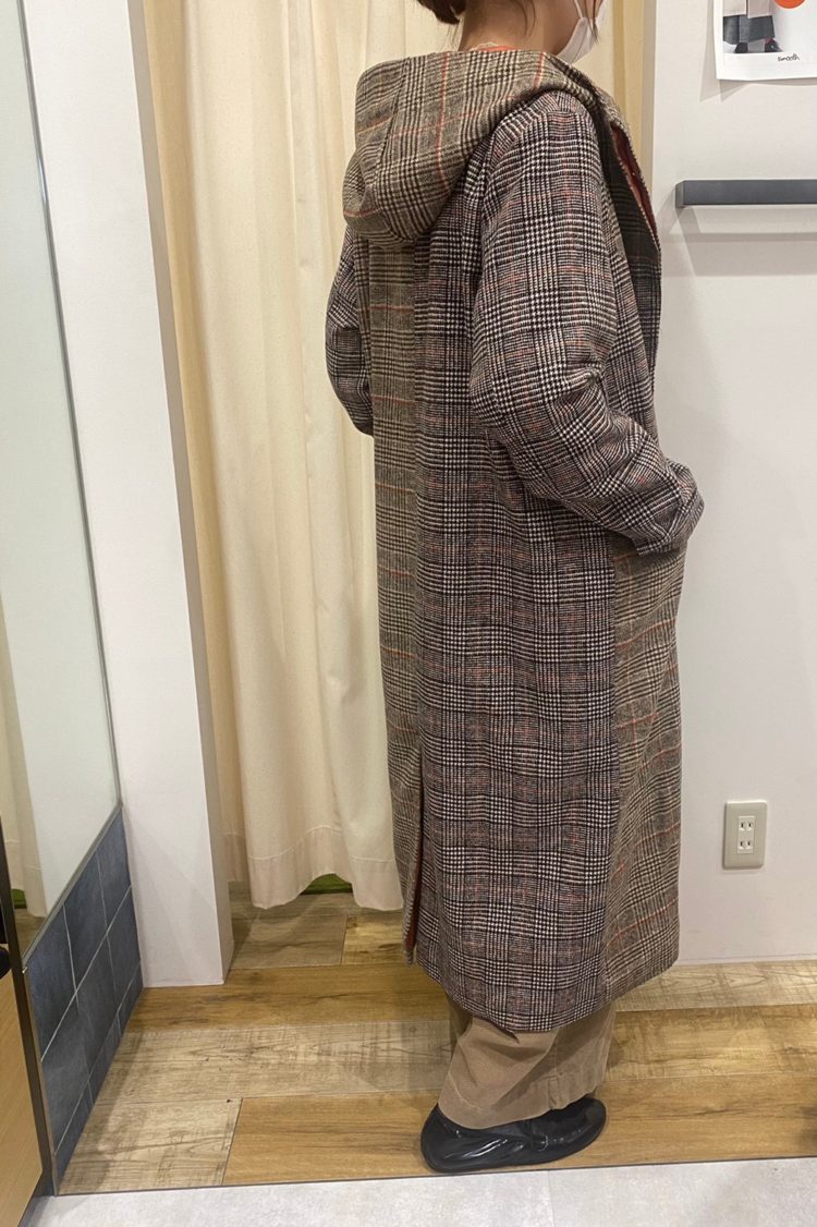 ゆったりした雰囲気のコーデに、チェック柄のロングコートを羽織ってみました。