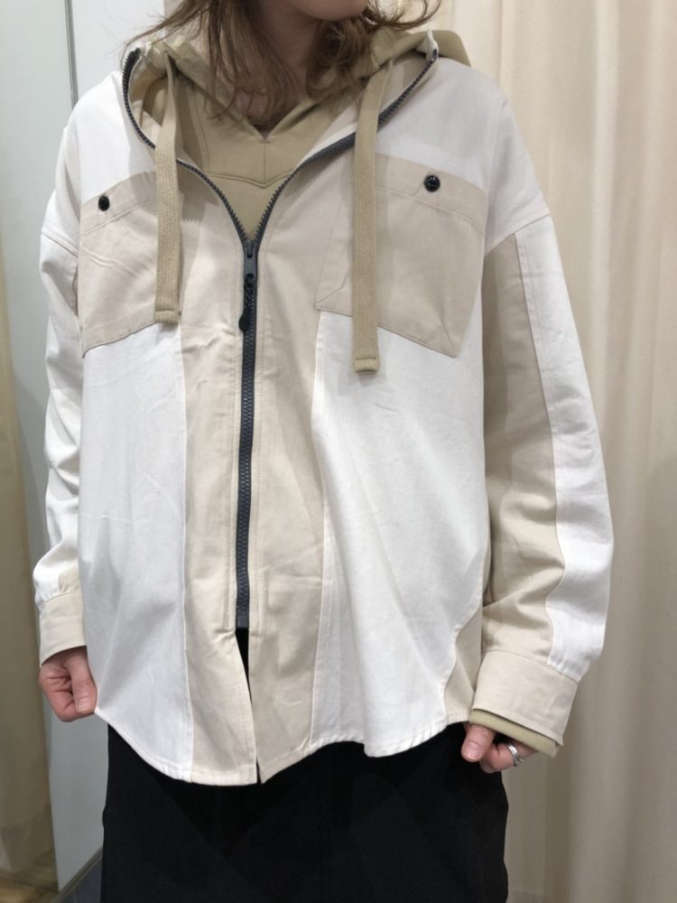 羽織ったのは、KAKELA&TRANQUILの異素材ジップシャツ。