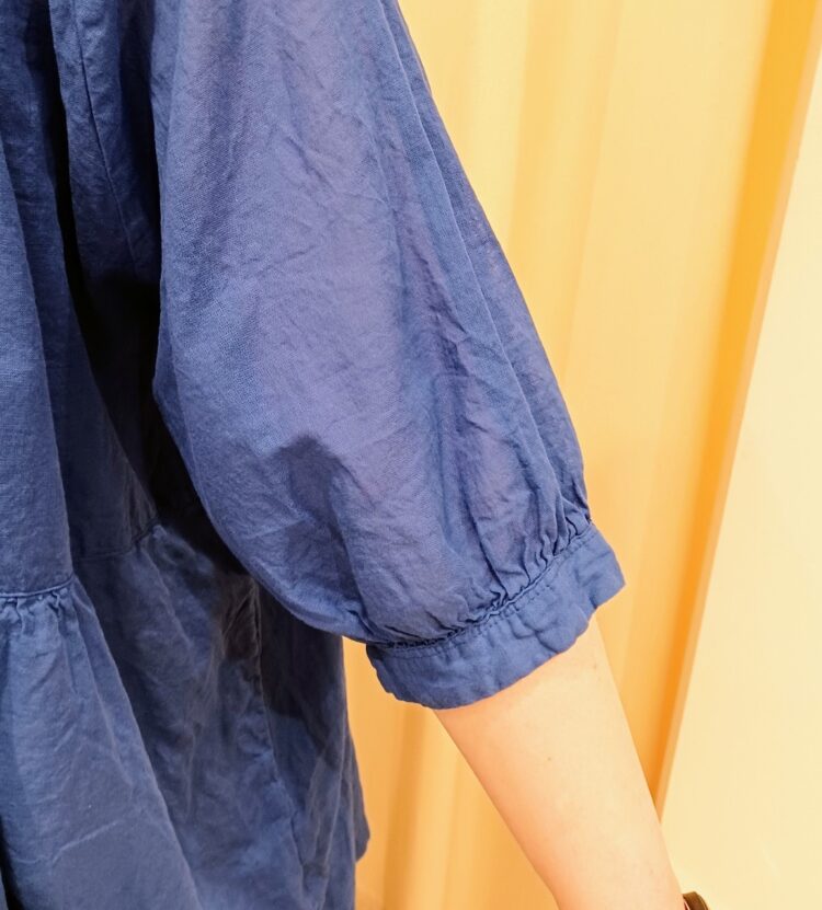 首もとの衿にはギャザーが入っていて、裾に向かってふんわりと広がるシルエットです。