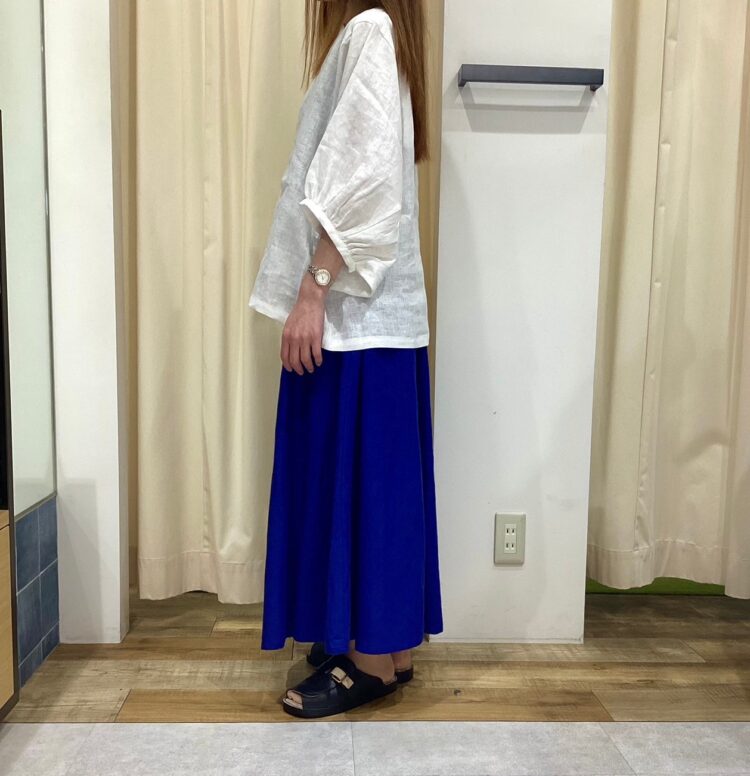 綿麻素材で涼しく、ボリュームも抑えてあるので、すっきりしたシルエットです!
