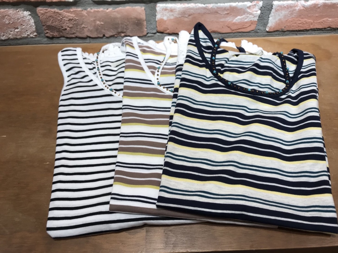 細かいストライプになっているので、総柄でも主張し過ぎず普段無地派の方にもオススメな1枚です!
