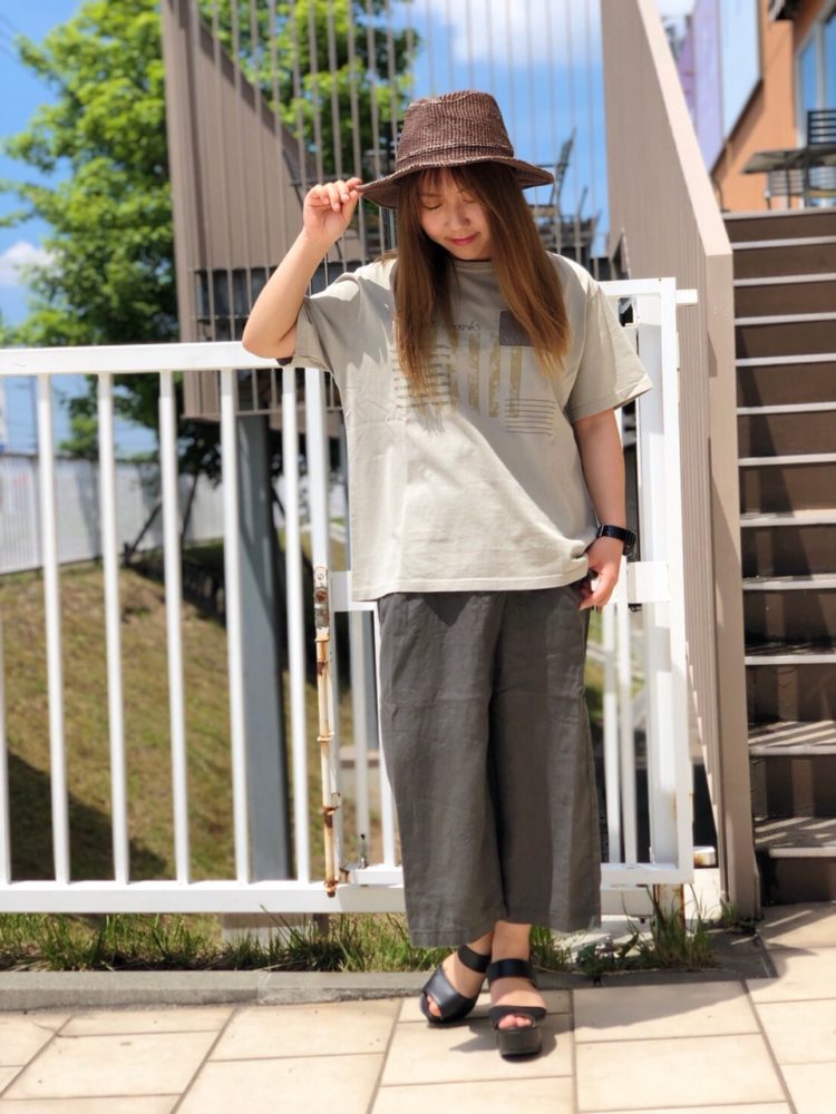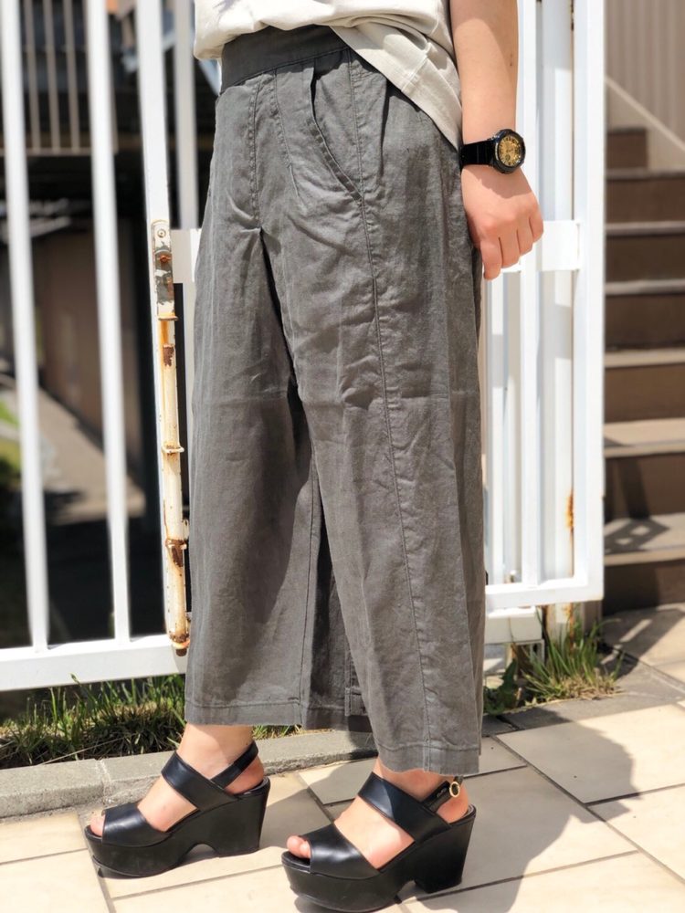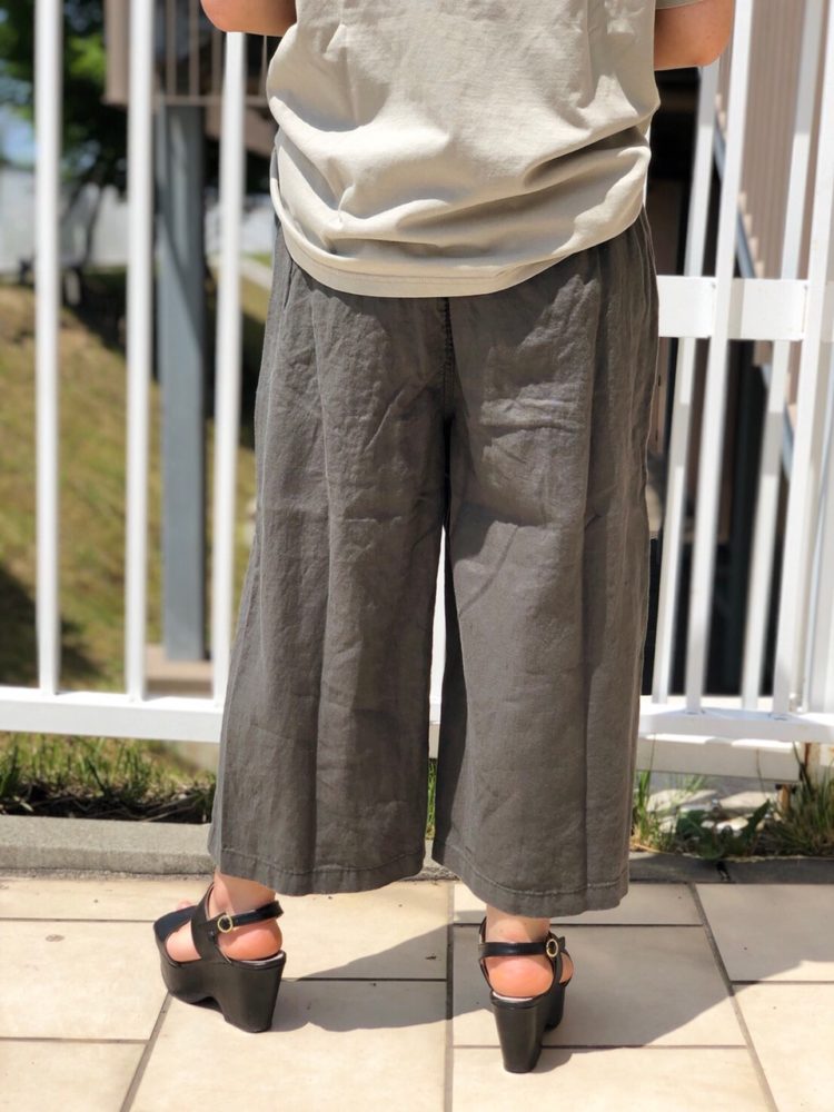 【ラップキュロット】 No.404-981-0000319 Col.ナチュラル、オリーブ(着用)、ストライプ Size.S、M、L PRICE¥7,900+税 ウエストをくるっと包むような デザインのラップキュロットパンツ♪ チクチク感はなく、麻ならではの ナチュラルな風合いを楽しめます♡ 腰回りは程よくフィットし、 裾に向かって広がるシルエットです!! 後ろはゴム仕様になっており、 窮屈感なく楽に穿いて頂けます!