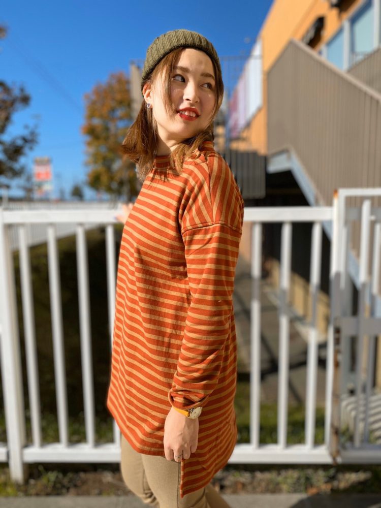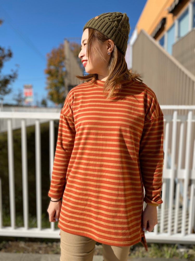 【裏フリースタートルネックチュニック】 No.160-941-0T59781 Col.ネイビー.トップグレー.オレンジ(着用).ブラック Size.L PRICE¥4,900+税 ボーダー柄が可愛いプルオーバー♡ 裏地がフリース生地になっているので 重ね着をしなくてもこの1枚で とても暖かいですよ♪ 後ろの方が丈が長くなっていて ヒップラインや体型カバーにも◎