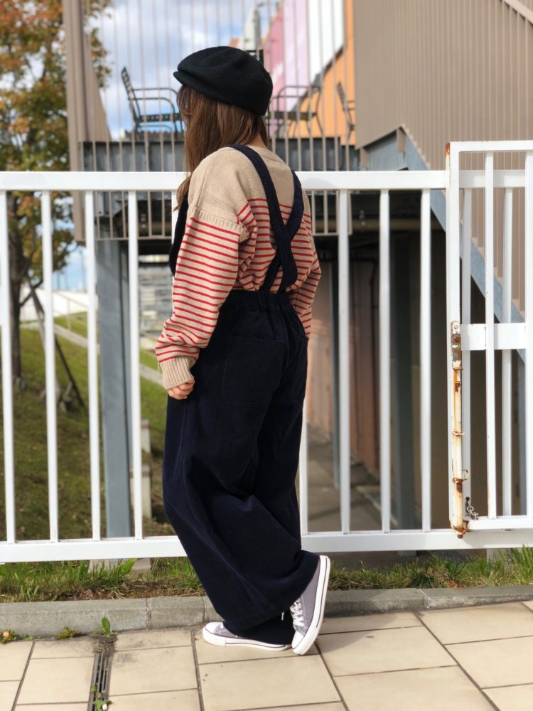 Model.150cm 【サス付コーデュロイワイドパンツ】 No.160-941-0PP9798 Col.ベージュ、ネイビー(着用) Size.L PRICE¥4,900+税 取り外し可能なサスペンダー付きの ワイドパンツ♪ サスペンダーの長さは調整可能です。 ウエストは後ろがゴム仕様なので ゆったりとした穿き心地!! 両サイドには便利な可愛い ポケット付きです!