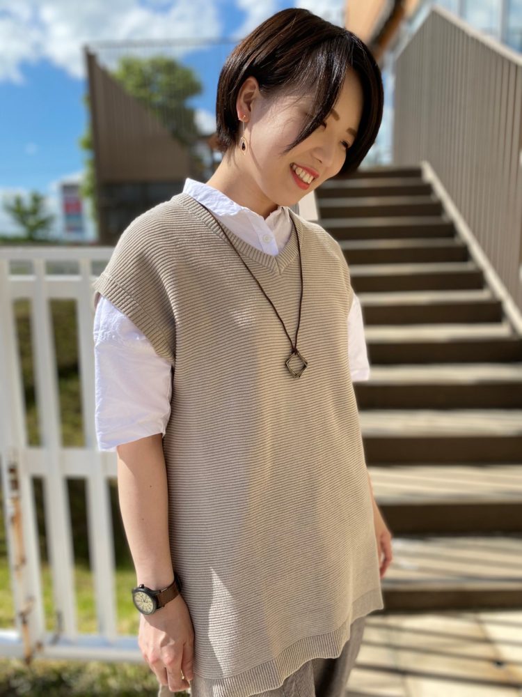 model/H159cm 【綿ニットベスト】 No.120-016-0001256 Size.F Col.オフシロ(着用)、グレーベージュ、ブラック PRICE¥2,900+税 肩が落ちるデザインで、 ゆるっと着られるサイズ感が今年らしい 柔らかい綿100%生地のニットベスト。 チクチクしにくい綿100%ニットは、 年間通して使いやすいので 1枚持っているととっても便利ですよ♪ シャツワンピースをレイヤードにして キレイめに着るのもおすすめです! カラーはこちら!