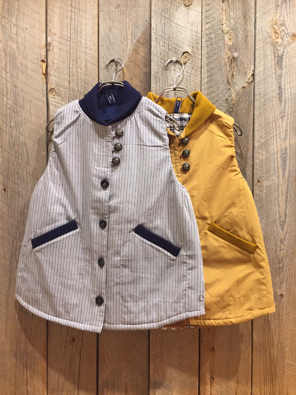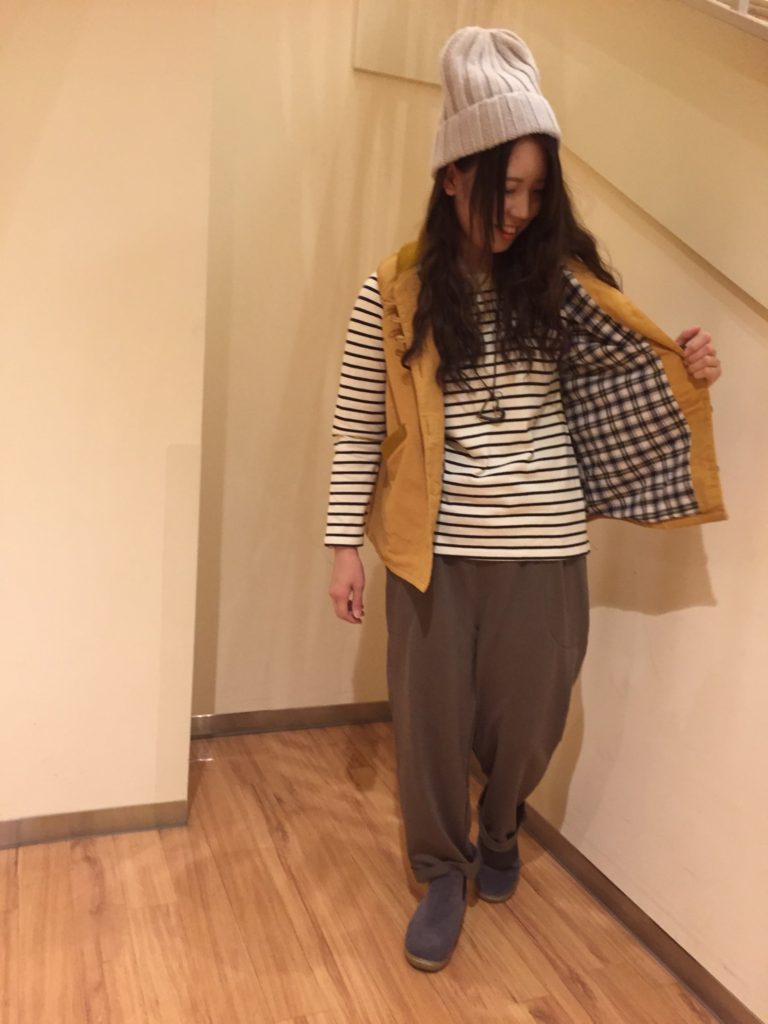 羽織った中綿ベストも ボタンがコロンとしていて 裏地も可愛いですよ♪ 丈感も長過ぎず使いやすいです◎ お色はこちら!