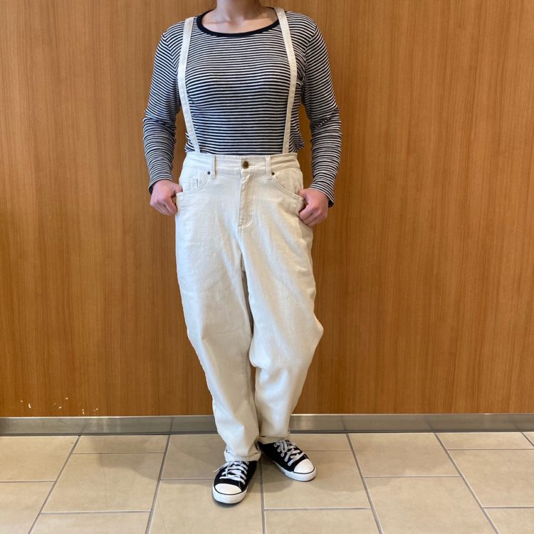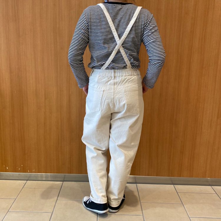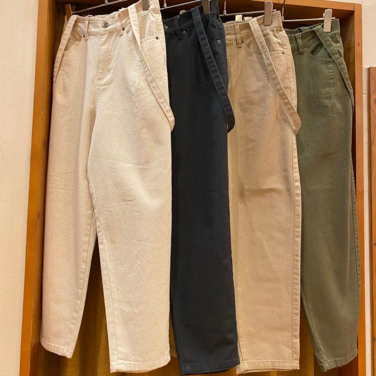 【綿ツイルサス付テーパードパンツ】 No.084-181-0125263 Col.アイボリー、ブラック ベージュ、カーキ(着用) Size.M、L PRICE¥4,900+税 サスペンダー付きテーパードパンツ。 ウエストはゴム仕様になっていて 楽チンな穿き心地♪ ヒップ周りはゆとりがありながら すっきりとしたテーパードシルエット。 サスペンダーは取り外し可能なので コーディネートの幅が ぐっと広がるアイテムです!! カラーは4色です!