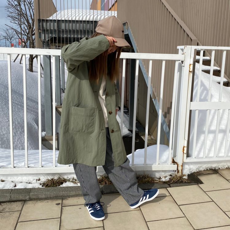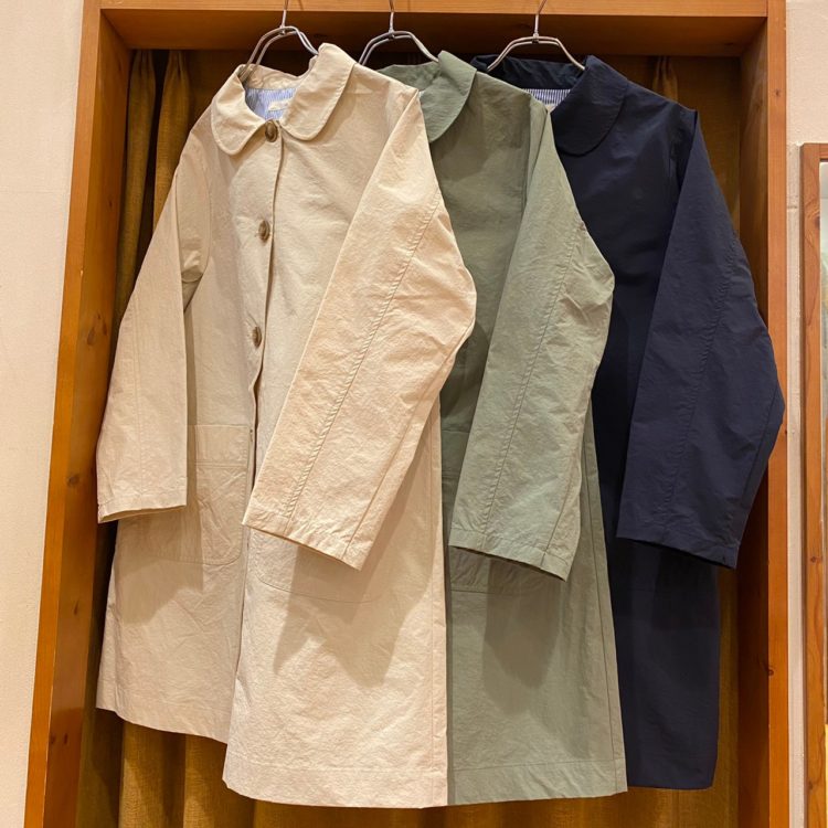 【ナイロンステンカラーコート】 No.084-107-0128009 Col. アイボリー、カーキ(着用)、ネイビー Size.F PRICE¥4,900+税