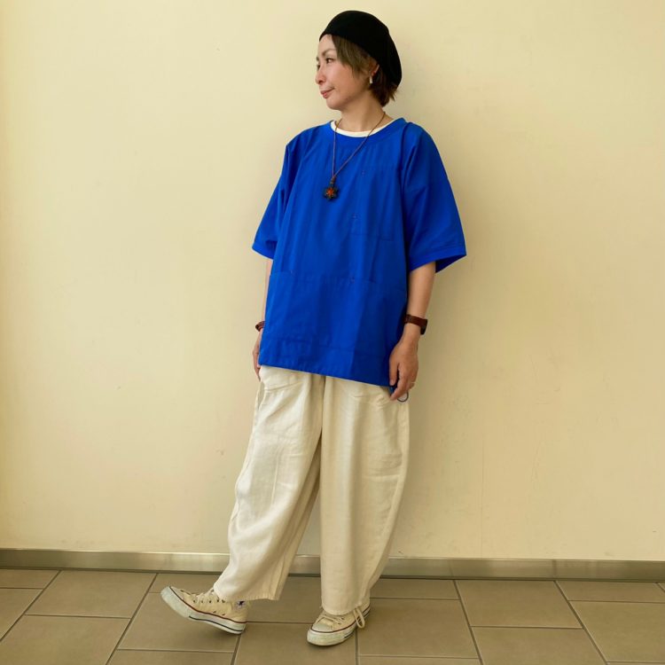 model:161cm 【3ポッケスモックTシャツ】 No.011-121-1920115 Col. ブラック、ブルー(着用)、オリーブ、 ベージュ、オフシロ Size.F PRICE¥3,900+税(税込価格¥4,290)