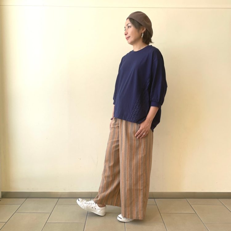 urnis outlet 北広島店のスタッフが、 直接ご対応させて頂きます。 画像だけでは分かりにくい商品の気になる点や、 通信販売も承りますので、 お気軽にご相談下さい♪ リゾートムードと清涼感のある 涼しげな素材で仕上げられた ストライプ柄のイージーパンツ。 とっても軽~い穿き心地で 撮影時に「何も穿いてないみたい!!」を 連呼した鈴木です(笑)。 ワイドシルエットで、 リラックスした中でも 女性らしさを引き出してくれます♪ オンオフ問わず幅広いシーンに使える 優秀パンツですよ〜 足元はスニーカーだけでなく サンダルやパンプスでも◎ ウエストはリボン・ゴム仕様と なっております!!