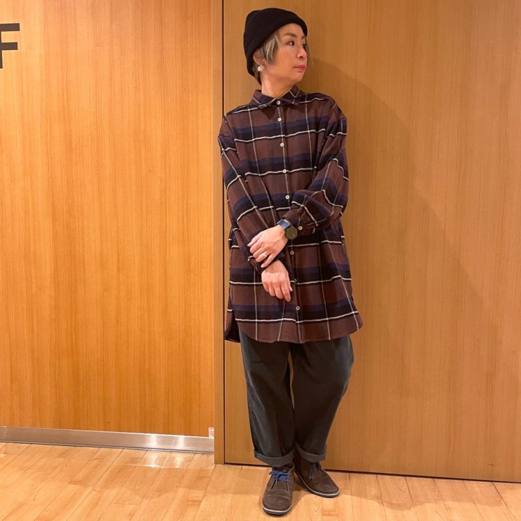 urnis outlet 北広島店のスタッフが、 直接ご対応させて頂きます。 画像だけでは分かりにくい商品の気になる点や、 通信販売も承りますので、 お気軽にご相談下さい♪ refined worksから入荷した 柔らかな厚手の綿起毛生地で仕立てられた シャツチュニックです。 綿100%なので優しい肌触り♡ オリジナルのチェック柄が特徴で、 1枚で目を惹くスタイリングが 完成しちゃいます! ボーイッシュになり過ぎない様に、 後ろヨーク下に重なりを付けた バックシャンな一着と なっております。 同素材のパンツを合わせた セットアップ風な着こなしもオススメです。