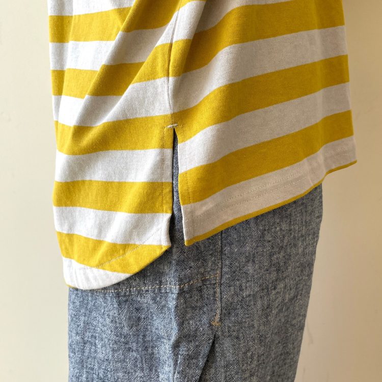 【16/OEボーダー天竺裾ラウンドPO】 No.120-218-0021209 Col.イエロー(着用).オレンジ.グリーン Size.F Price.¥2,900+税(税込価格¥3,190)
