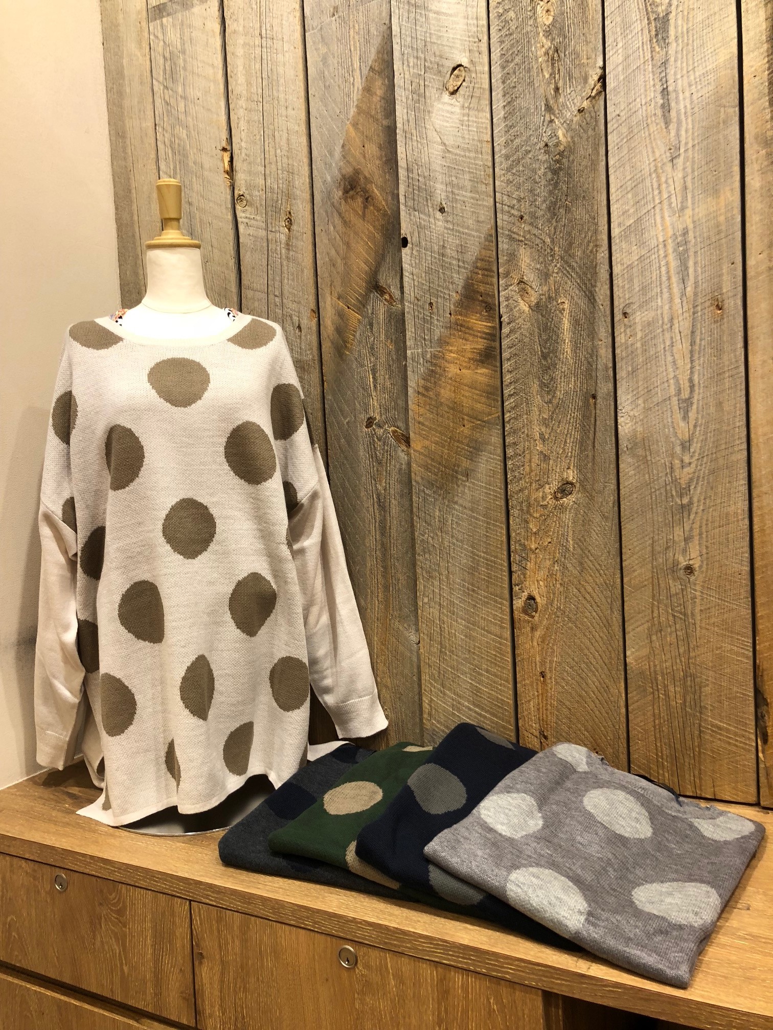 model:H161cm 【アクリルニットドットチュニック】 No.091-752-8109002 Size.F Col.グリーン(着用).ナチュラル.チャコール ネイビー.グレー Price.¥3,900+税→¥2,900+税 ドットが目を惹くニット、 見た瞬間にもう購入決定の ノンフレです(笑) 子供っぽくなりがちなドット柄ですが、 こちらのニットは心配ご無用ですよ♪ 大きめなドット&落ち着いた配色なので 大人可愛く着られます♡ 薄手で柔らかいので とっても着やすい!動きやすい! 中にシャツを合わせても◎ 全5色です。