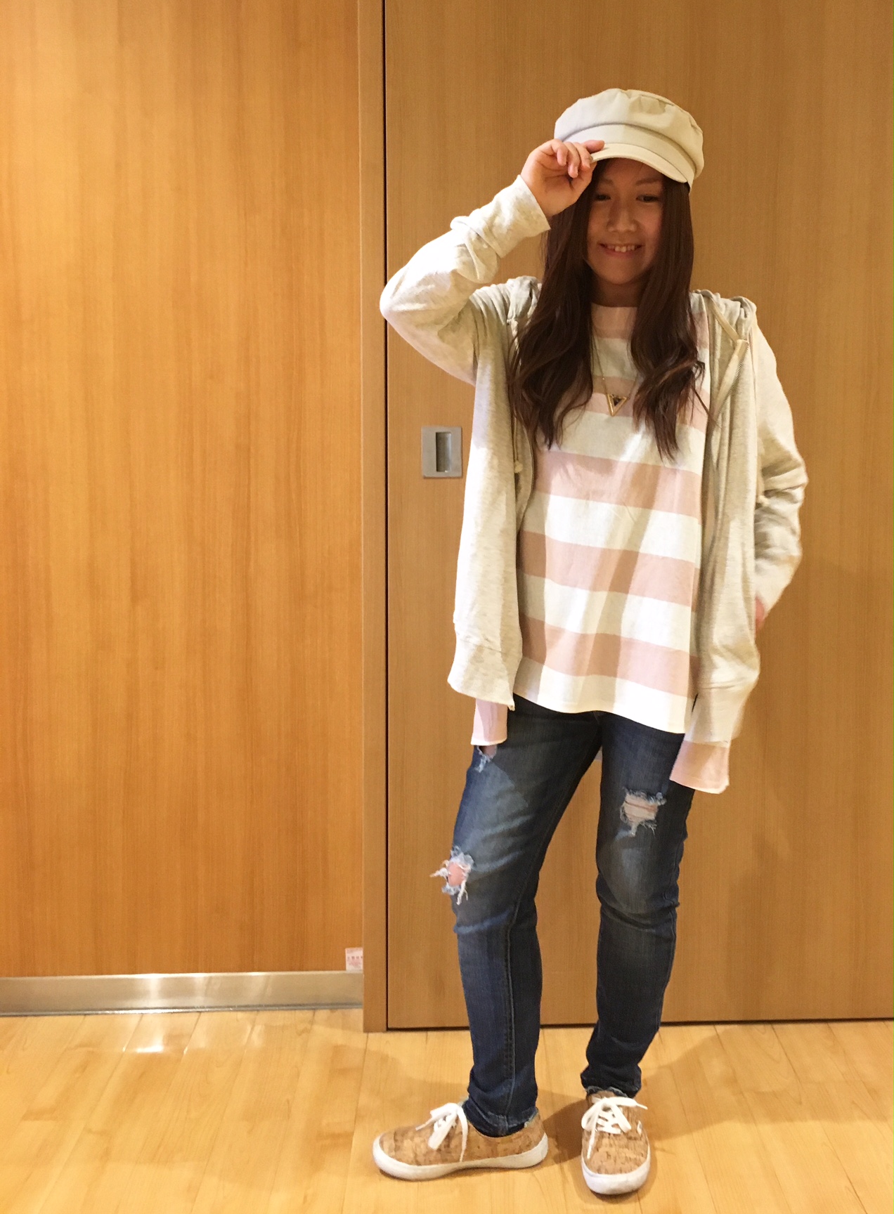 【ボーダー段差切替PO(半袖)】 No.120-717-0071339 Col.イエロー、ピンク(着用)、ネイビー、ミントグリーン、グレーベージュ Size.F Price.¥3,500+税→¥1,900+税 まずは最初にボーダープルオーバーをご紹介します! こちらはゆったりとしたサイズ感で 綿素材なのでやわらかで着心地が良く、 後ろは丈が長めなので体型をカバーしてくれます! 袖は肘が隠れるくらいでちょっと長めです。 二の腕カバーしたい・・・という方にオススメです!
