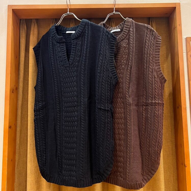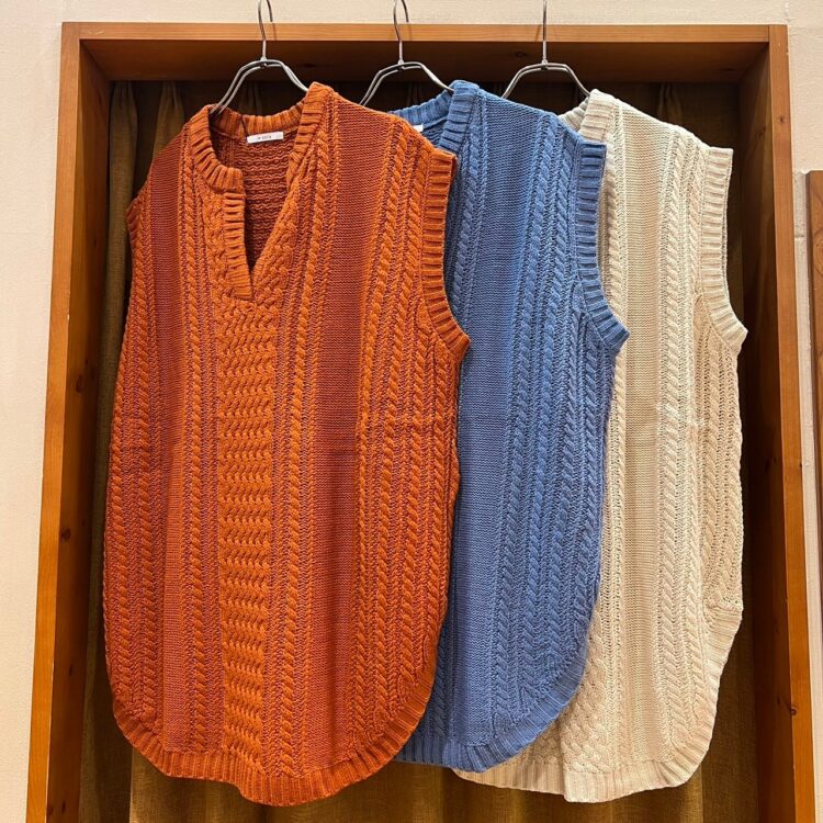 【le colis】 バルキーMIX編みまるチュニックベスト No.092-339-3666311 Col.ブラック、チョコレート オレンジ(着用)、ブルー、オイスター Size.F PRICE¥3,900+税(税込価格¥4,290)