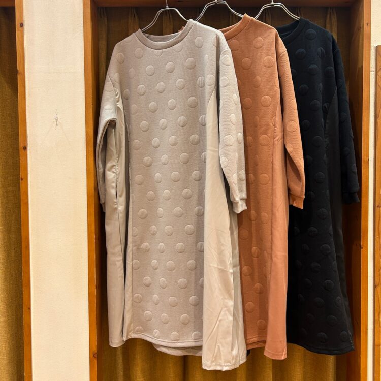 urnis outlet 北広島店のスタッフが、 直接ご対応させて頂きます。 画像だけでは分かりにくい商品の気になる点や、 通信販売も承りますので、 お気軽にご相談下さい♪ ふくれジャカードのドットがあしらわれた ワンピース。 サイドを光沢のある布帛で切り替えた 異素材使いもポイントです!