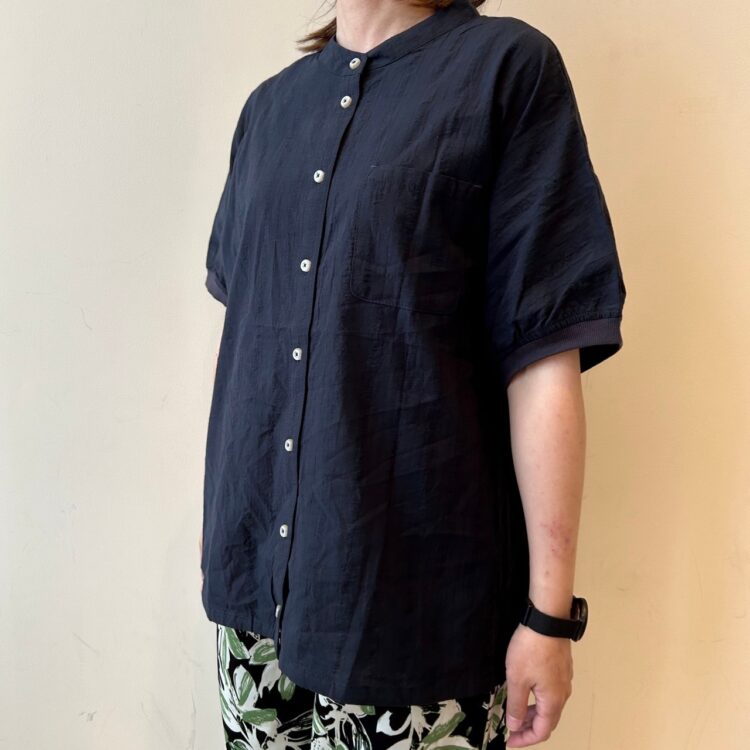 【NORTHERN TRUCK】 スタンドカラーストリングBL No.160-417-CMD4195 Col.オフシロ(着用).グリーン.チャコール Size.L PRICE¥3,900+税(税込価格¥4,290) ほのかにストライプ柄を感じる ストリング生地のブラウス。 裾に通ったリボンを絞って バルーンシルエットにしても◎です。