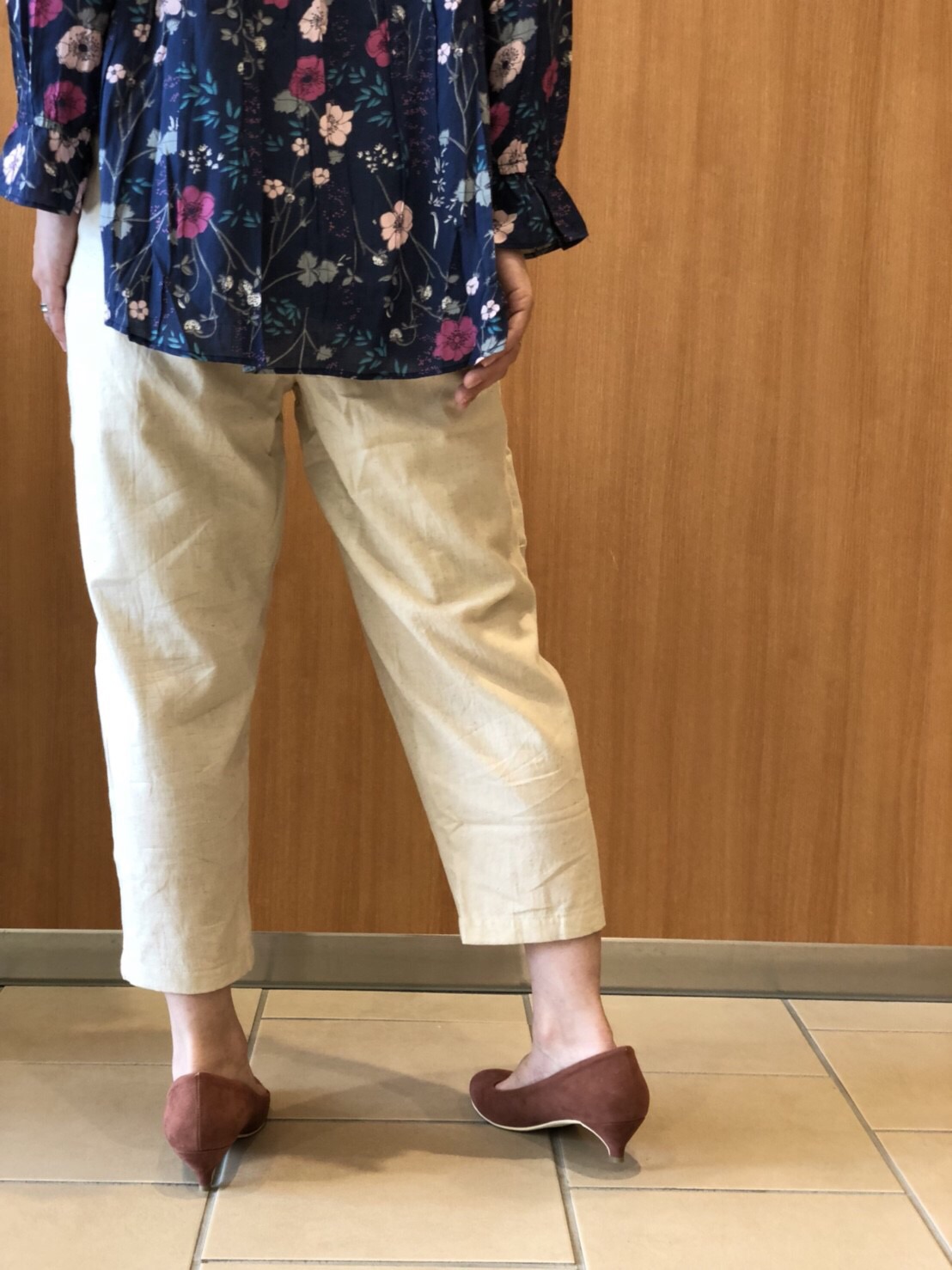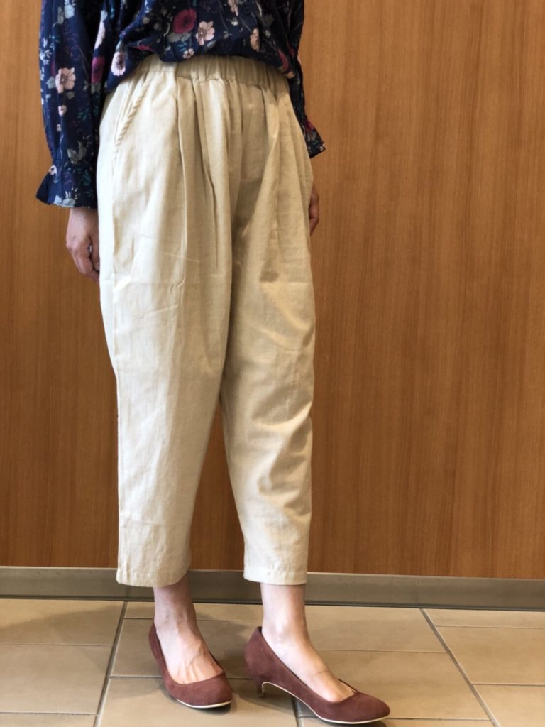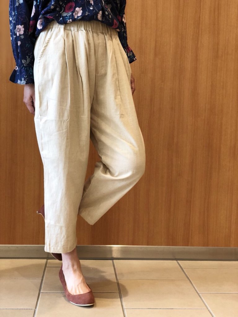 こちらのパンツ。 本当に楽ちんで着まわし易いので色違いで欲しいくらい! ウエストもゴム入りです♪ トップスがネイビーなので ナチュラルを合わせて涼やかな色合わせにしてみました! 生地に麻が入っているのですが、 綿100%の裏地が付いている為、 麻の素材が苦手な方でも安心して穿けますよ。 続いてこちらです♪