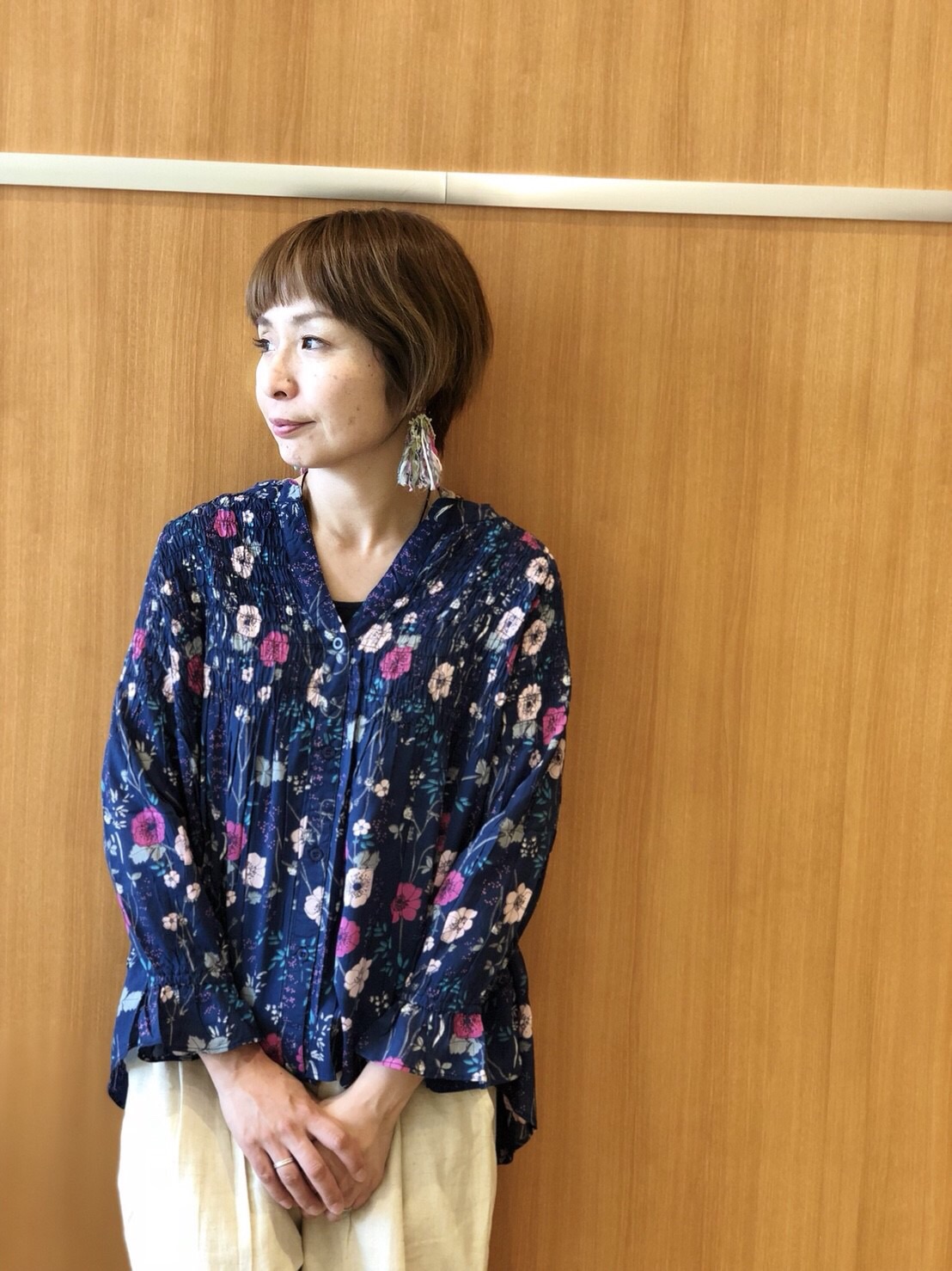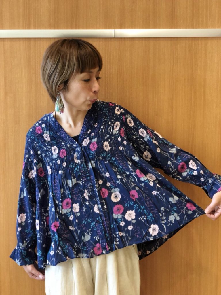 Model. 161cm 【花柄ネックアラウンドシャーリングギャザープルオーバー】 NO.162-822-0180354 Size.F Price. ¥4,900+税 →¥2,900+税 Col. オフシロ、マスタード、ブルー(着用) 全3色です。