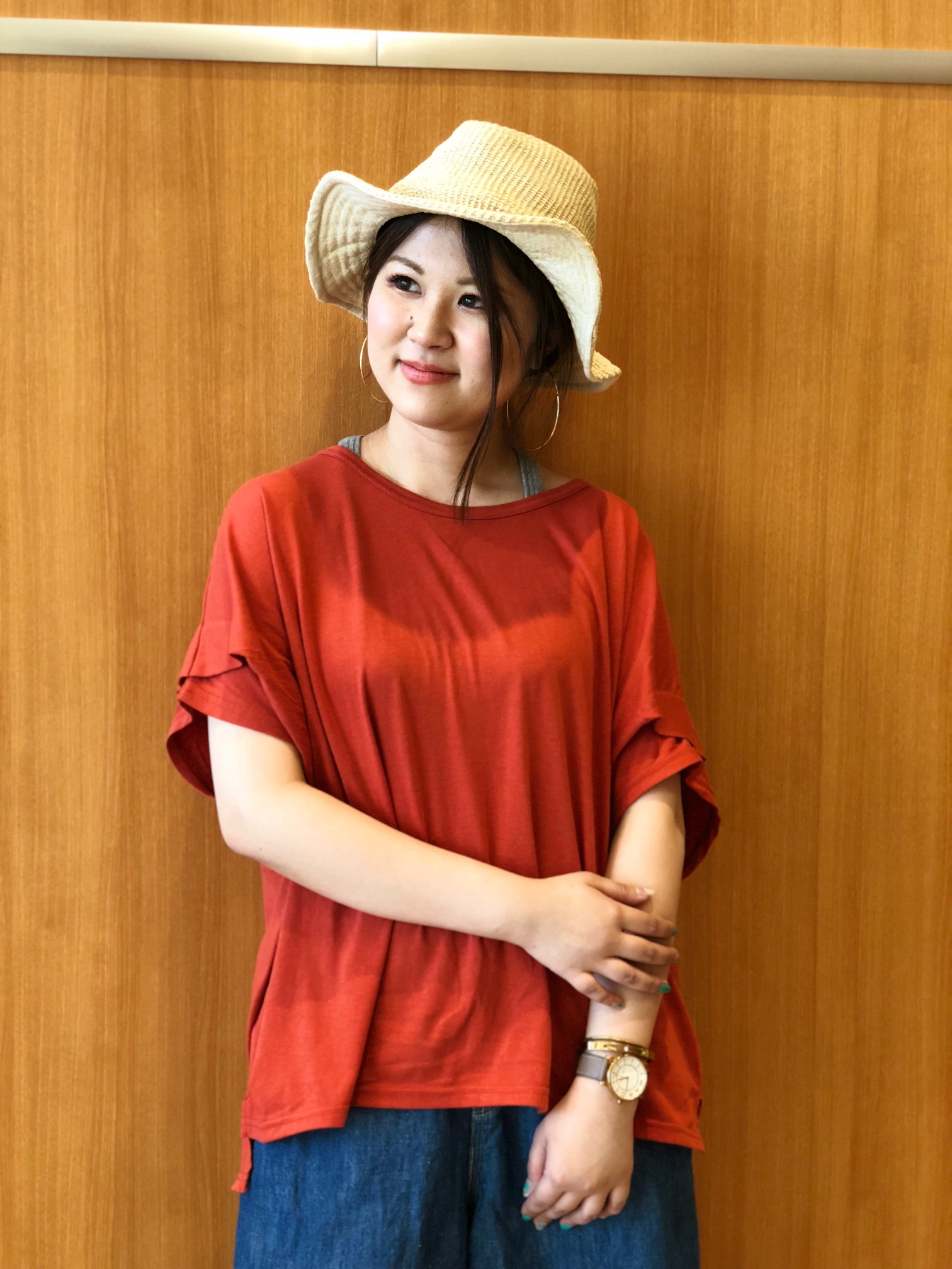 【model.155cm】 【天竺袖変形ドルマンTシャツ】 No.120-822-0081556 Col.オフシロ、ターコイズ、カーキ、レンガ(着用)、チャコール Size.F outlet Price.¥1,500+税 【iriey】から着心地バツグンのカットソーが 入荷しましたよーー!! 綿×ポリエステルなので 綿100%よりも さらっとした肌触り♡ そして何より軽い着心地ー!! ドルマンなのでゆったり着られます! わたしは入荷したその日に買いました。笑