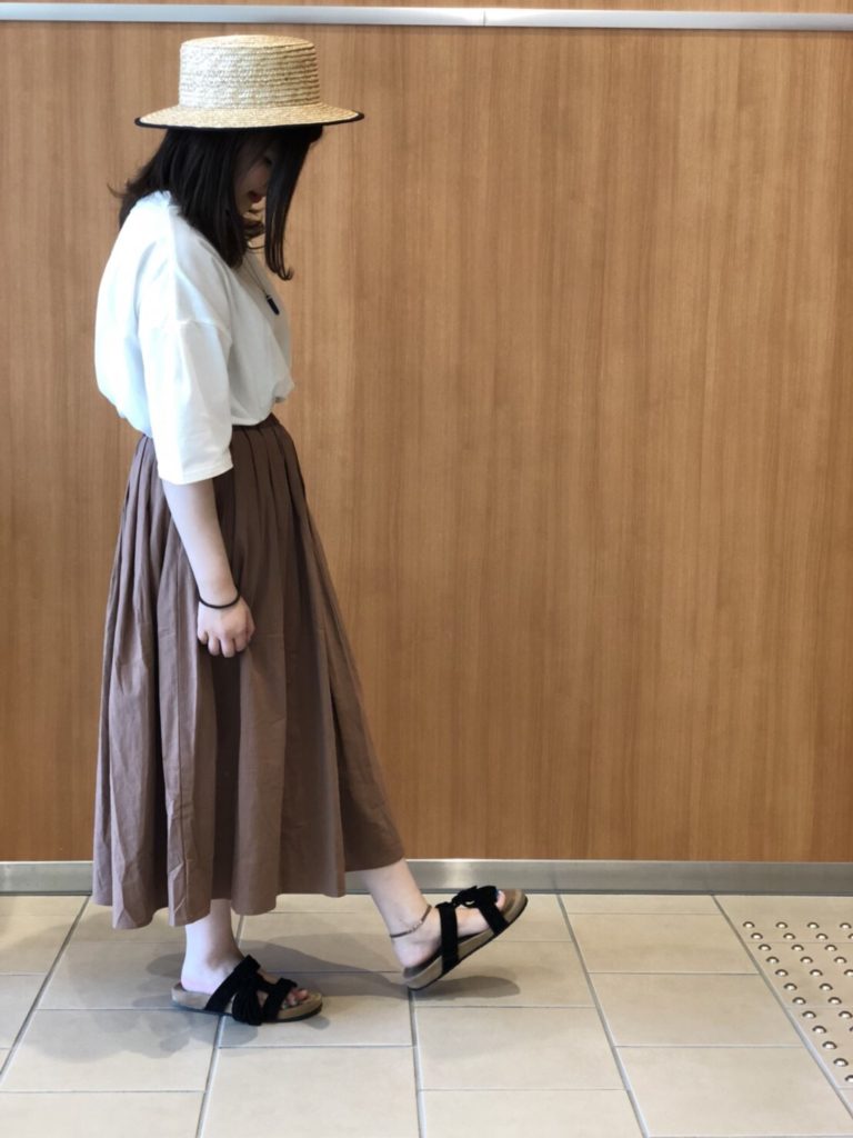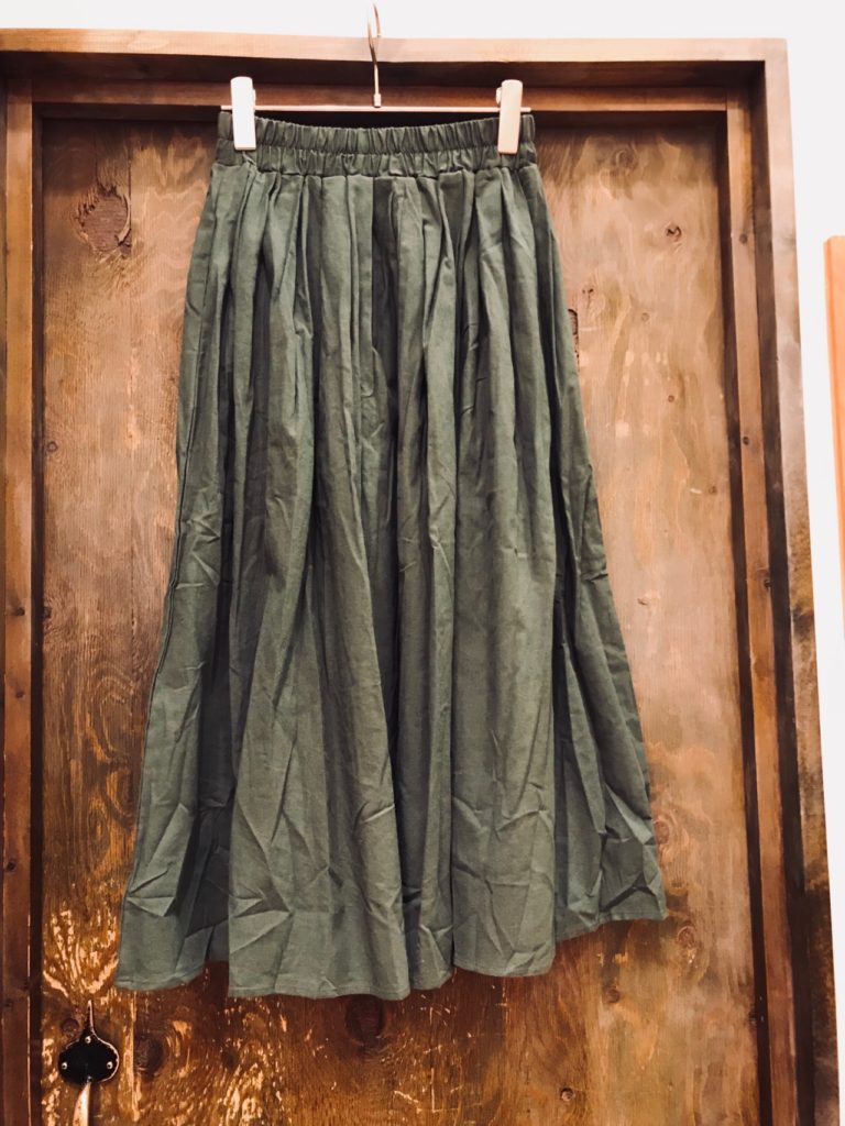 【ウォッシュコットンタックスカート】 No.162-825-0180909 Col.ベージュ(着用)、グリーン、ネイビー、ブラック Size.F SALE PRICE→¥2,900+税 暑くなるこの季節には あると絶対使えるスカート♪ しっかりめのコットンで ハリがあるのが特徴的!! タック入りなので上品で 女性らしい印象に!! 裾も広がりすぎないので、 全体のボリューム感がほどよい♪ おまけにウエストは総ゴムなので お腹周りの負担ゼロです。