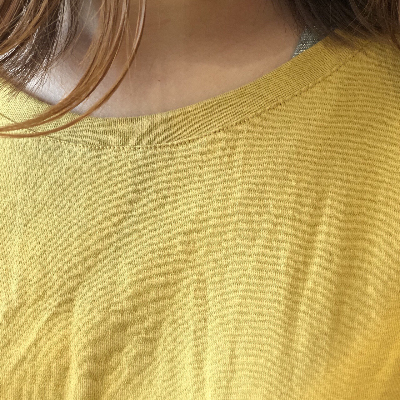 【ヴィンテージ天竺ロゴ刺繍2wayPO】 No.091-827-8121026 Col.ホワイト、グレー、ブラック、イエロー(着用)、ネイビー Size.F SALE PRICE¥2,300+税 ラウンドネック×Vネックの 2wayデザインが魅力のプルオーバー♪