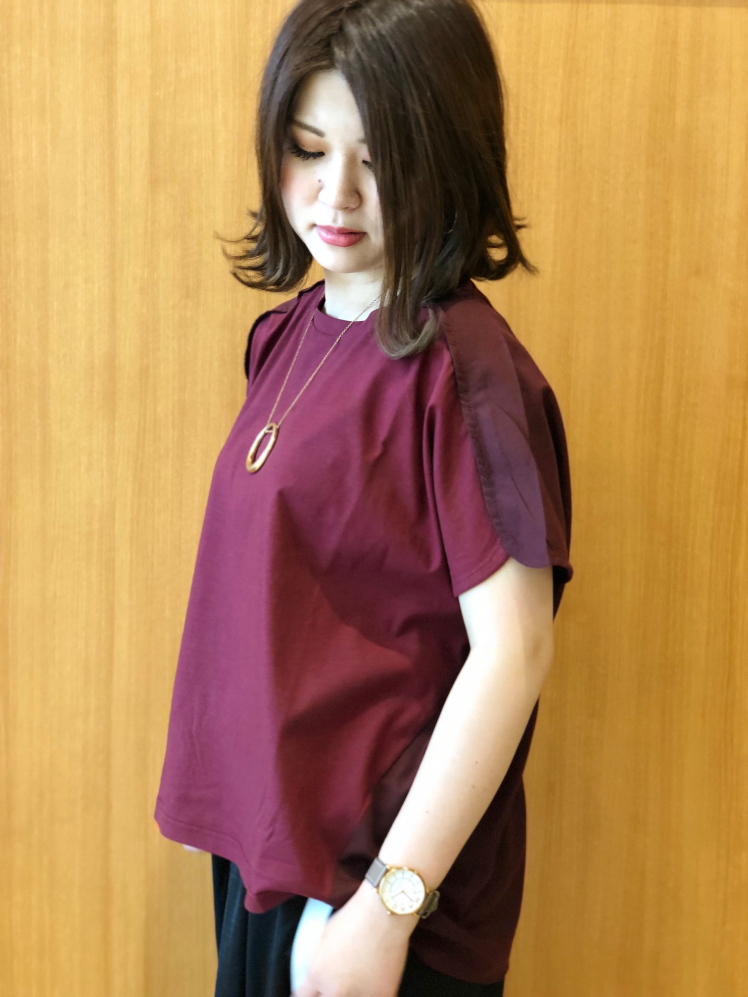 【ドルマン天竺*ローンプルオーバー】 No. 018-825-2404132 Col. オフシロ、ボルドー(着用)、カーキ、ネイビー Size. F SALE PRICE ¥2,900+税 デザイン性の高いプルオーバー! 前後で異素材になっているのが特徴的です。 ドルマンなので腕周りも楽チン!
