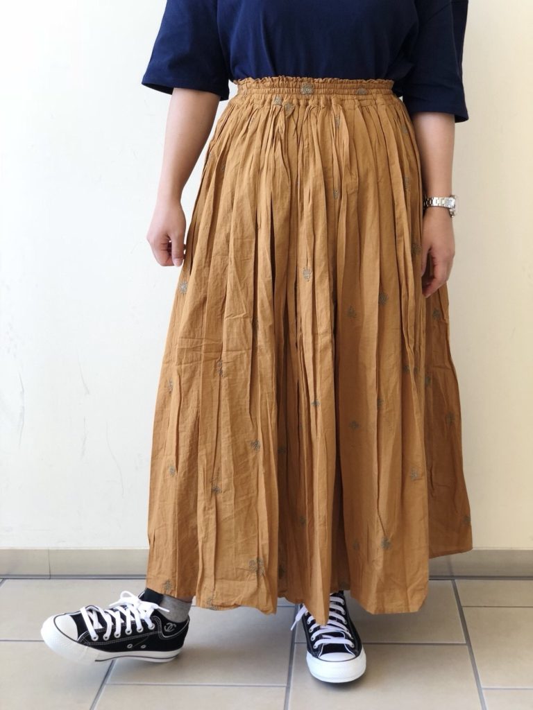 【総柄刺繍スカート】 No.162-830-0180722 Col.ベージュ、マスタード(着用)、カーキ、ネイビー Size.F SALE PRICE¥2,900+税 さらりとした肌触りと軽い着心地が魅力の 刺繍が可愛いロングスカート!! ウエストはゴムなので楽チン♪ トップスはシンプルの方が スカートが映えますよ♡ スニーカーとの相性抜群♡ サンダルでも◎ お色は4色です!