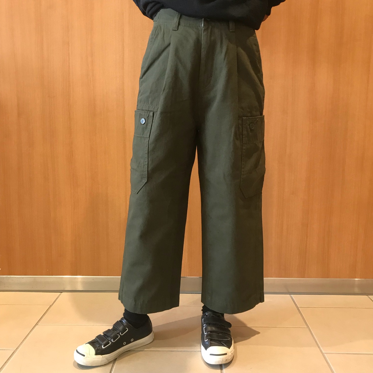 model:H161cm 【タックミリタリーワイドパンツ】 No.404-877-0000305 Size.M.L Col.カーキ(着用). ブラウン PRICE¥7,900+税 トレンドアイテムであるワークパンツ♪ 裾に向かってストレートラインに見える ワイドなデザインがポイントです。 強度に優れ、耐久性が高く ワークウェアやミリタリー系の 定番素材として多く使われている ダック生地で作られたこちらのパンツ♪ 程良くハリ感を残しつつ、 女性が穿きやすい生地感に 仕上げられています。 カーゴポケット口にはタックを入れ、 脇側にボリュームを持たせる事で 立体的なシルエットに。 ウエスト背面部分がゴム仕様なので とーっても楽チンで穿きやすく、 ウエストinもしやすい! ウエストの尾錠で搾って ハイウエストで穿いても○ですよ~