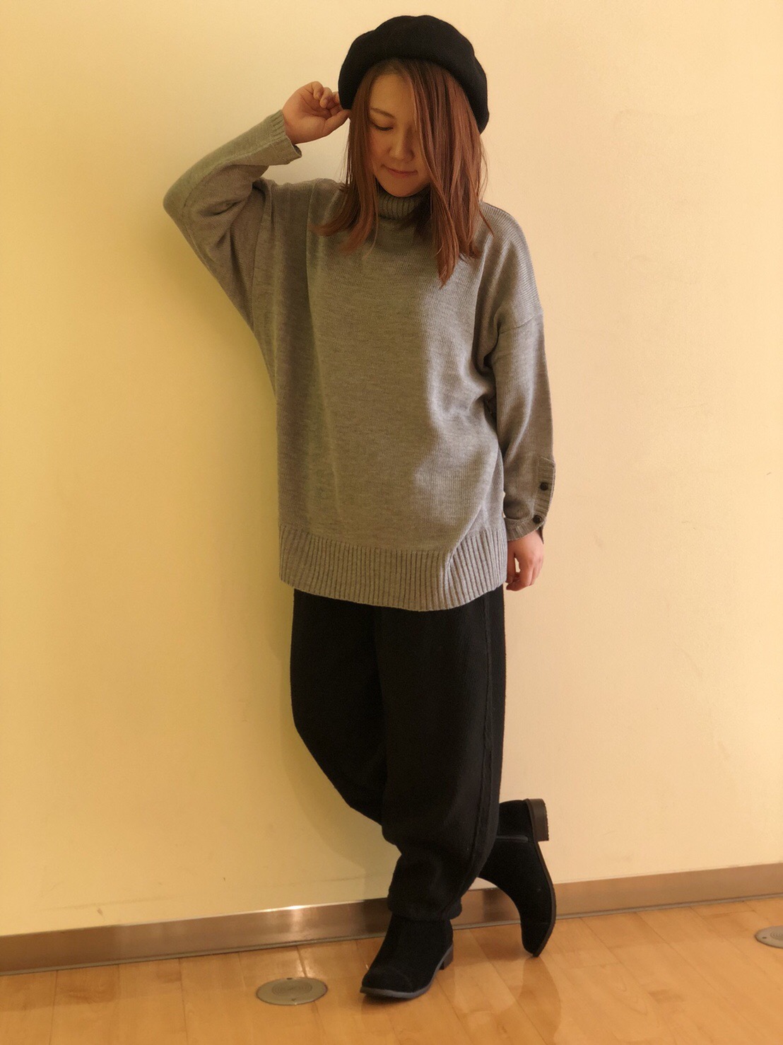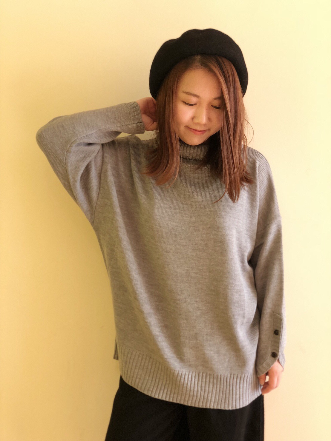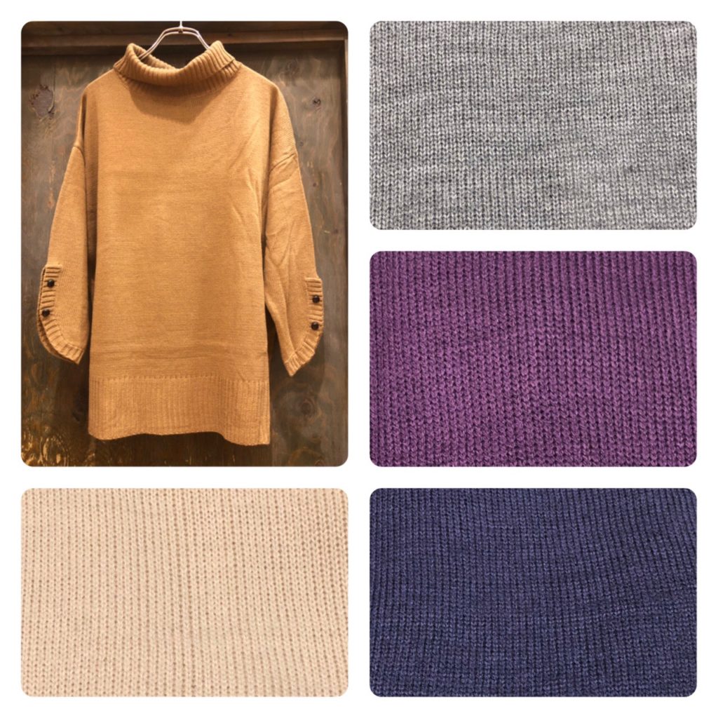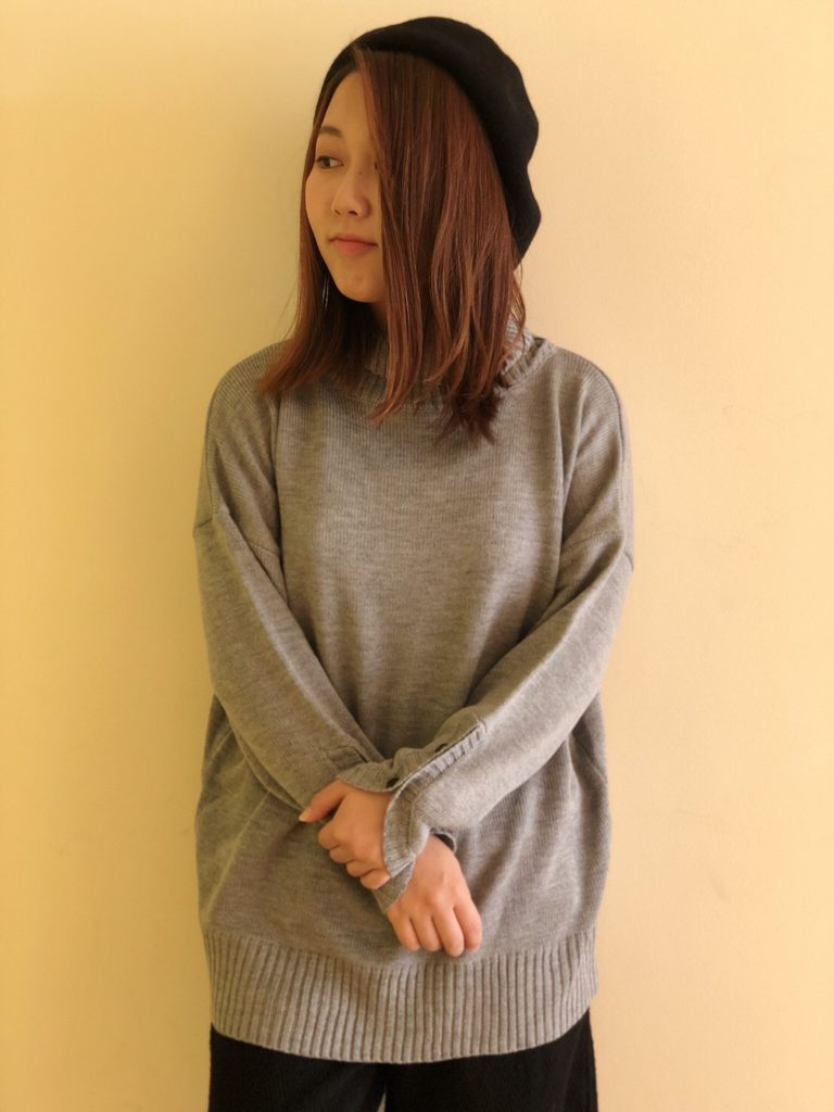 【タートル袖スリットニットプルオーバー】 No.182-842-0031313 Col.ホワイト、L/グレイ(着用)、マスタード、ネイビー、パープル Size.F OUTLET PRICE¥2,900+税 ゆったり着られるニットプルオーバー♪ 素材感はとてもやわらかく、 着心地が良いです!!! シンプルなのでどんなスタイルにも 合わせやすい優秀な1枚です!! パンツスタイル、スカートスタイル どちらでも◎ 袖のくるみボタンが可愛いですよ♡