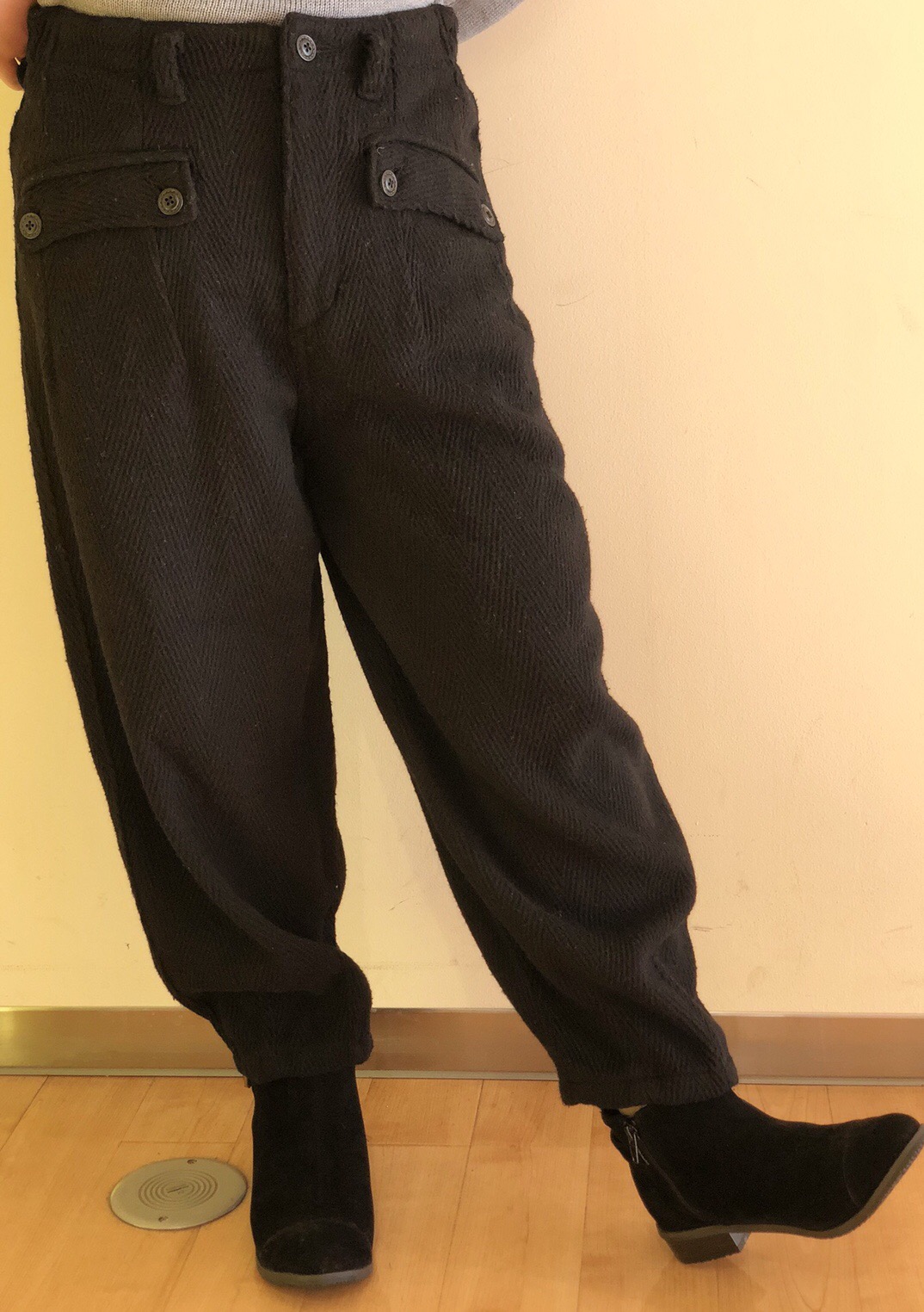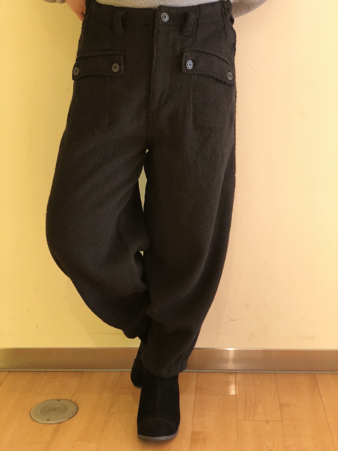 【ダーツ裾パンツ】 No.160-840-0TP8783 Col.ブラック(着用)、カーキ、ネイビー Size.M、L PRICE¥4,900+税 幅の広い太ヘリンボーンが特徴的です! 秋冬の季節感を感じるパンツ♪ 裾口に4カ所ダーツが入り、 裾部分でギュッと絞って ワイドのメリハリが効いたシルエット♪ フロントはボタン2個付きの フラップポケットになっております!! アンクル丈なのでスッキリ見えます! 気になる脚のラインもカバーしてくれてますよ〜 暖かく楽チンなので普段使いしたい方に オススメのボトムです♡ お色は、、、