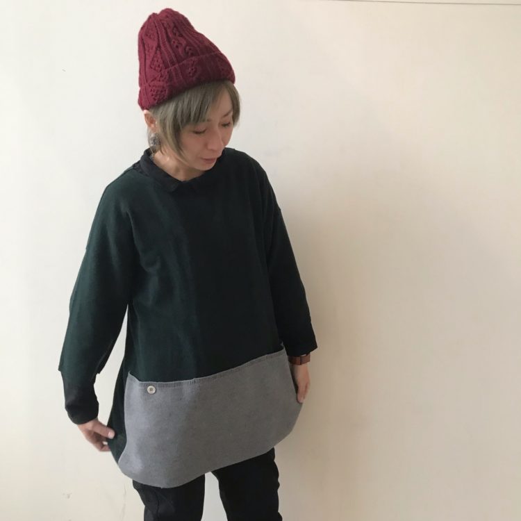 model:H161cm 【バイカラーニットチュニック】 No.160-850-0T98888 Size.L Col.グリーン(着用).ネイビー グレー PRICE¥4,900+税 大きなポケットが特徴的な ノーザントラックのニットチュニック。