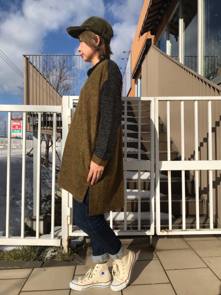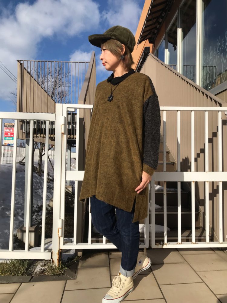 【イカリチャーム付バイカラーチュニック】 No.160-851-0T68860 Size.L Col.(着用).ベージュ.ネイビー.カーキ PRICE¥4,900+税 後ろ丈長めでシルエットが綺麗な ニットチュニック♪ 身幅ゆったりで楽ちんな着心地です! 開き過ぎないVネックは シャツやタートルとの相性が良く、 着回しやすいですよ~ ふんわり&もこもこしたニット地が とーっても温かい♡ ワンポイントのイカリチャームは アンティーク調に仕上げられています♪
